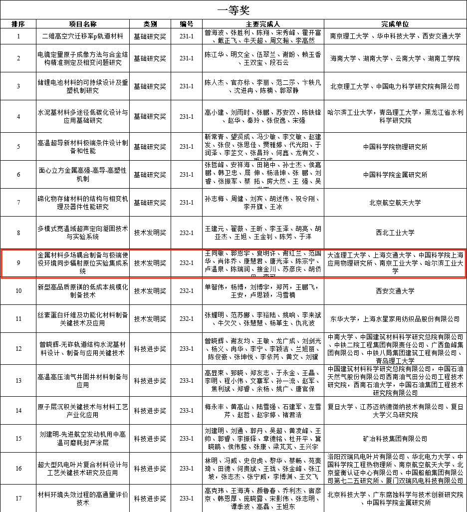 中国材料研究学会科学技术奖是经国家科学技术奖励工作办公室批准设立,旨在奖励为对材料科学前沿研究具有深远影响的、被公认的重要发现和材料技术重大突破的创新成果;对发展高技术有巨大推动作用的关键新材料合成与制造技术;对提升传统材料品质和促进产业技术进步影响面广、经济效益巨大的工程技术开发成果,是面向全国材料领域的重要科技奖项。“2023年中国材料研究学会科学技术奖”共评选出获奖项目38项,其中一等奖17项,二等奖21项。