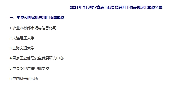 9月6日,中央网信办等15个部门联合发文,对全国“2023年全民数字素养与技能提升月”活动组织实施工作中表现突出的单位进行通报表扬,我校获评中央和国家机关部门所属单位“2023年全民数字素养与技能提升月工作表现突出单位”。