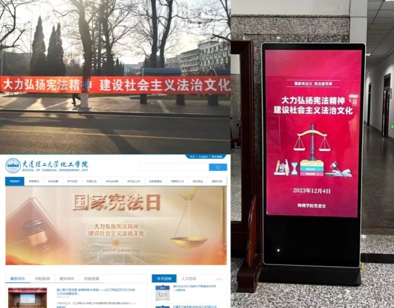 学校网站主页设置“国家宪法日”主题大图,全校各类宣传阵地开展全方位法治宣传,形成多层次、渗透式的宣传格局。各基层单位利用条幅标语、电子屏、专题展板、新媒体平台等阵地营造宪法宣传的良好氛围。学校理论学习官方微信“大工微理论”在宪法宣传周突出主题、普及宪法知识,引导广大师生坚定维护宪法权威、自觉履行并带头宣传宪法精神。