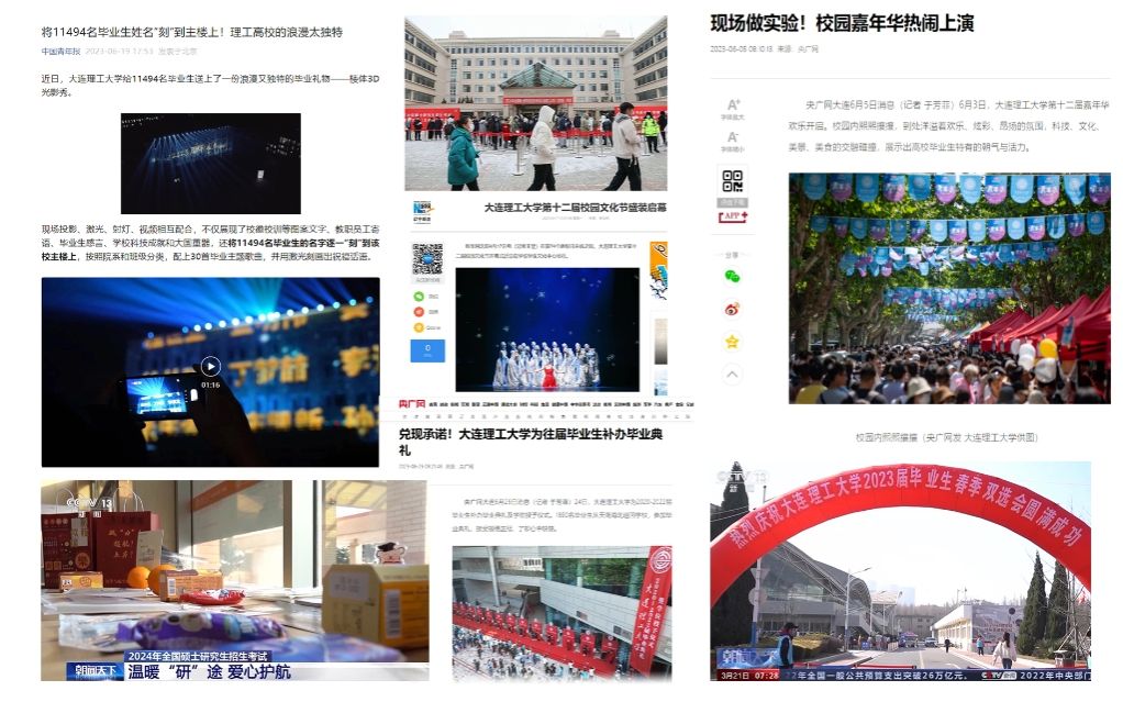 魅力大工建设彰显“软实力”,幸福大工建设彰显发展生机,为提振发展信心,凝聚奋进力量,聚焦魅力大工、幸福大工建设积极开展对外宣传。校园文化节、国际文化节以及嘉年华等文化活动获光明日报、央广网等媒体关注报道。坚持以师生为中心,打造高质量学生成长平台,毕业季、招生季、就业季以及考研季等系列暖心活动、举措经推介被多家媒体聚焦。邀请人民日报、新华社全程直播学校毕业季、招生季相关活动,吸引超500万人次在线观看。“大连理工大学组织人员及时清扫从学生宿舍区到教学楼的道路……”考研期间学校的暖心举措多次登上央视新闻。