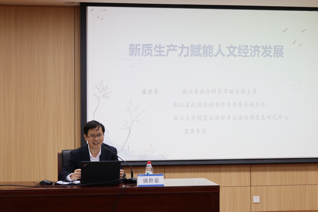习近平总书记在参加全国两会江苏代表团审议时指出:“文化很发达的地方,经济照样走在前面。可以研究一下这里面的人文经济学。”5月20日下午,学校邀请浙江省政协常委、浙江省社会科学界联合会主席盛世豪教授做客“大工讲坛”,作题为《新质生产力赋能人文经济发展》主题报告,解读习近平总书记关于“人文经济学”的重要讲话精神。报告会由人文学院承办,人文学院院长李伦教授主持。