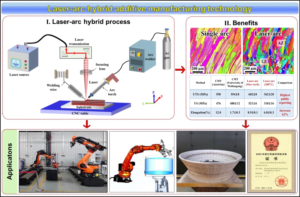项目简介:针对高强铝合金单一激光或电弧增材制造缺陷多、性能差的瓶颈问题,将能量定域可控的激光与高效率的电弧进行耦合,发明了激光-电弧复合增材制造技术。以该技术研制出集成于双机械手的激光-电弧复合增材制造装备,实现了大型高强铝合金复杂构件的低缺陷、高质量制备,其性能指标能与锻件相媲美,并成功应用于国家重大装备的研制,经济效益累计7000余万元,且获得了江苏省科学技术一等奖。