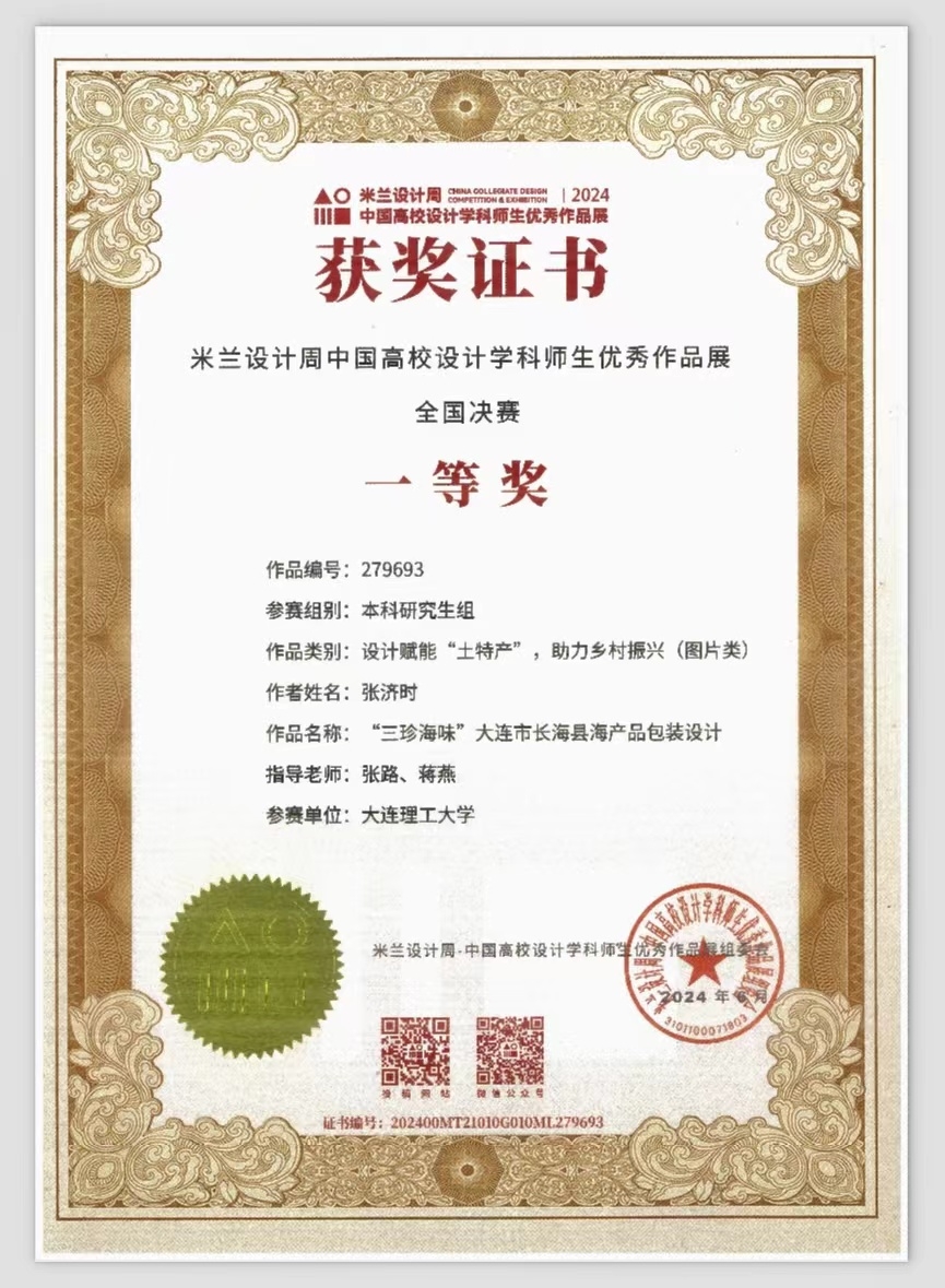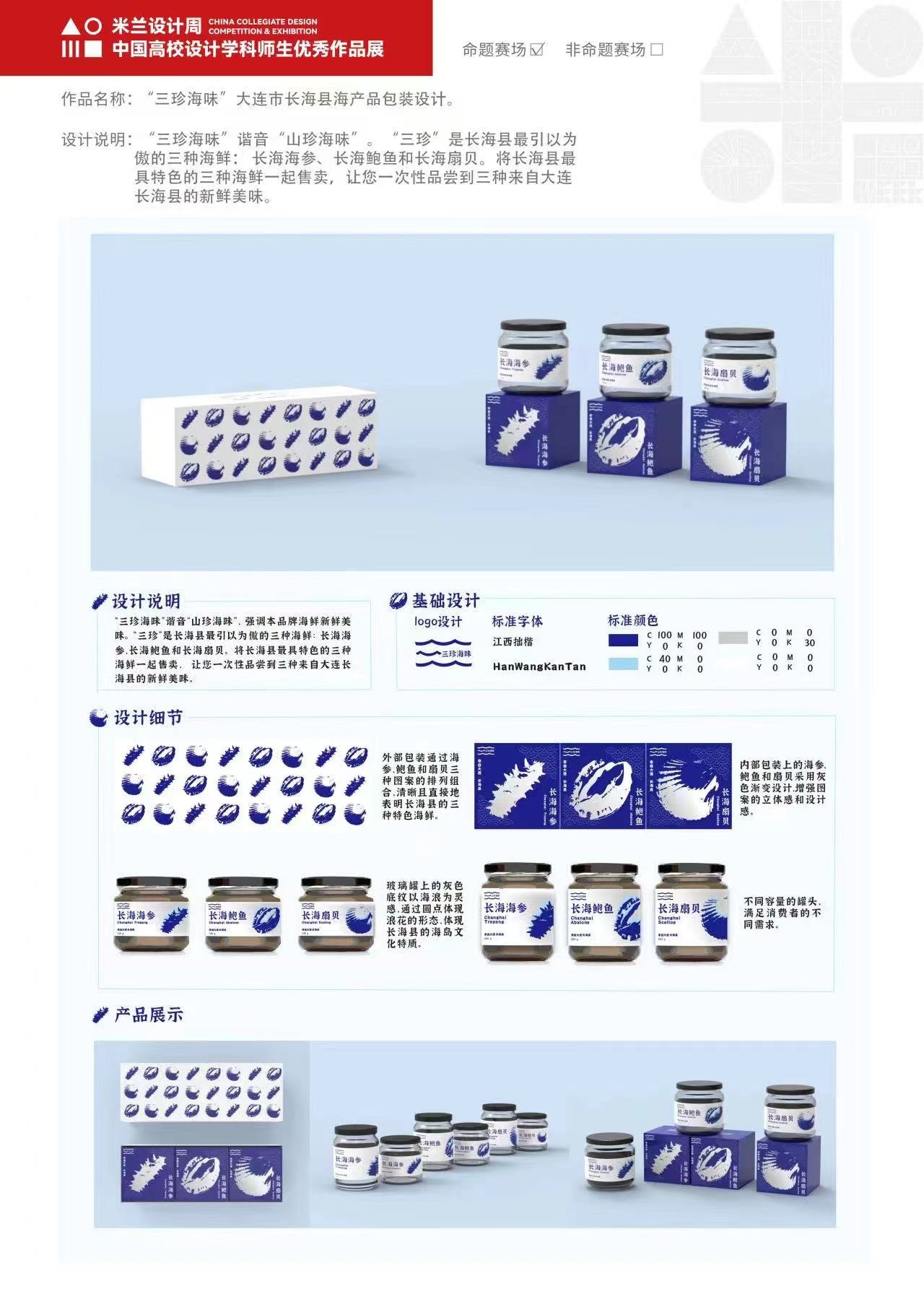 由建筑与艺术学院工业设计系张路、蒋燕老师指导,21级张济时同学设计的作品《“三珍海味”大连市长海县海产品包装设计》喜获米兰设计周-中国高校设计学科师生优秀作品展全国决赛一等奖。