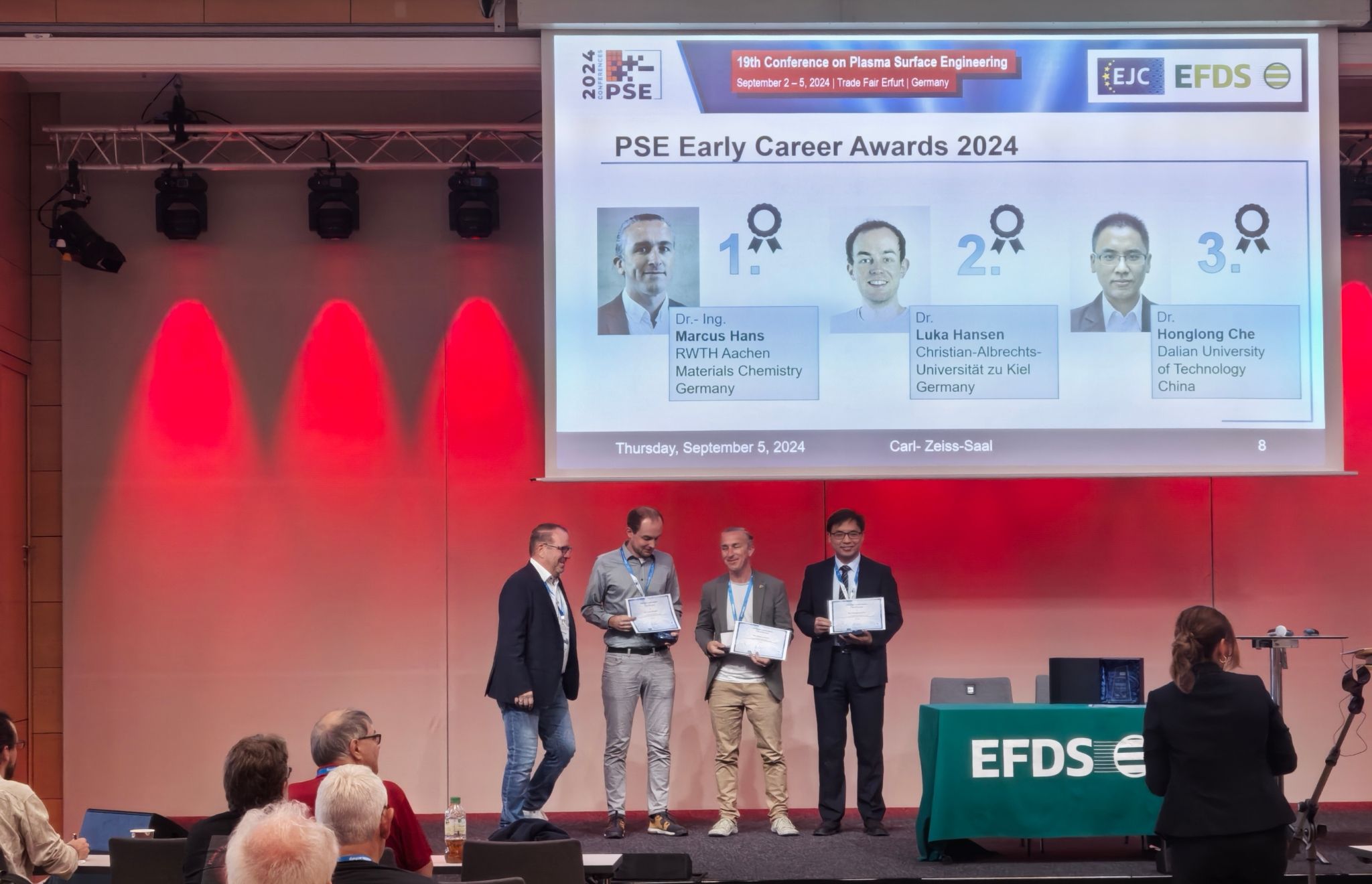 9月2日至5日,德国埃尔福特举行的第19届等离子体表面工程(Plasma Surface Engineering)国际学术会议上,车宏龙副教授获得由欧洲等离子体和离子表面工程联合委员会(EJC/PISE)颁发的“青年科学家奖”。该奖项包括一位“PSE杰出科学家奖(Leading Scientist Award)”和三位“PSE青年科学家奖(Early Career Award)”。青年科学家奖被提名者要求应具有在获得最高学位后最多10年的研究经历。今年,全球共有16个国家青年学者角逐“青年科学家奖”。最终,车宏龙以高票与两名来自德国的青年学者共同荣获了这一殊荣,也是该委员会成立30多年来中国学者第一次获得该奖项。