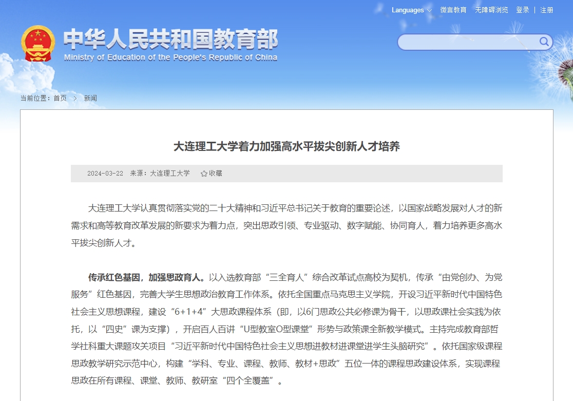 不断加强和改进新时代学校思想政治教育,建立了学科、专业、课程、教师、教材各个层级的课程思政建设评价体系。结合理工科学科专业特色,推进习近平总书记关于思维方式的重要论述进课程、进课堂、进教学改革,不断加强和改进新时代高校思政课程教学建设,持续提高思政课的针对性和吸引力,坚持用“七大思维”厚铸学生科学思维素质,培养学生发现、分析、研究、解决问题的能力。大力推进学科、专业、课程思政教学改革落地见效,“三进”工作经验举措在教育部课程思政研究示范中心年度会议上交流分享。依托首批国家级课程思政教学研究示范中心,外国语学院教师团队荣获“2024年高等学校外语课程思政优秀教学案例现场交流活动”国赛特等奖,并获“2024年外语微课优秀作品现场交流活动”全国决赛一等奖,大连理工大学获得“十年荣誉奖”。学校获批辽宁省课程思政示范课程、教学名师、教学团队7项,课程思政教学研究示范中心1项,位列全省高校第一。