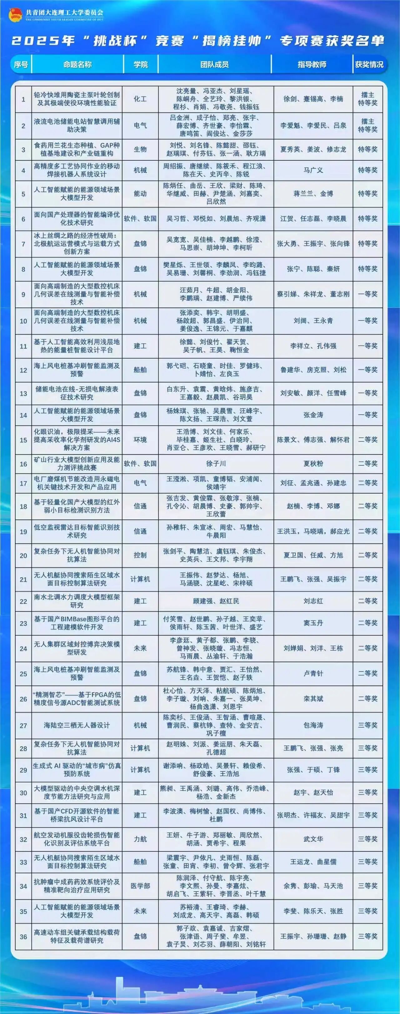 今年,在“挑战杯”2025年度中国青年科技创新“揭榜挂帅”擂台赛中,我校共61个团队报名,覆盖37个题目,取得擂主2项、特等奖8项、一等奖6项、二等奖12项、三等奖10项等36项奖励。此前,在本届“挑战杯”竞赛2024年度“揭榜挂帅”专项赛中,我校共获得擂主1项、特等奖8项、一等奖4项、二等奖5项、三等奖4项。
