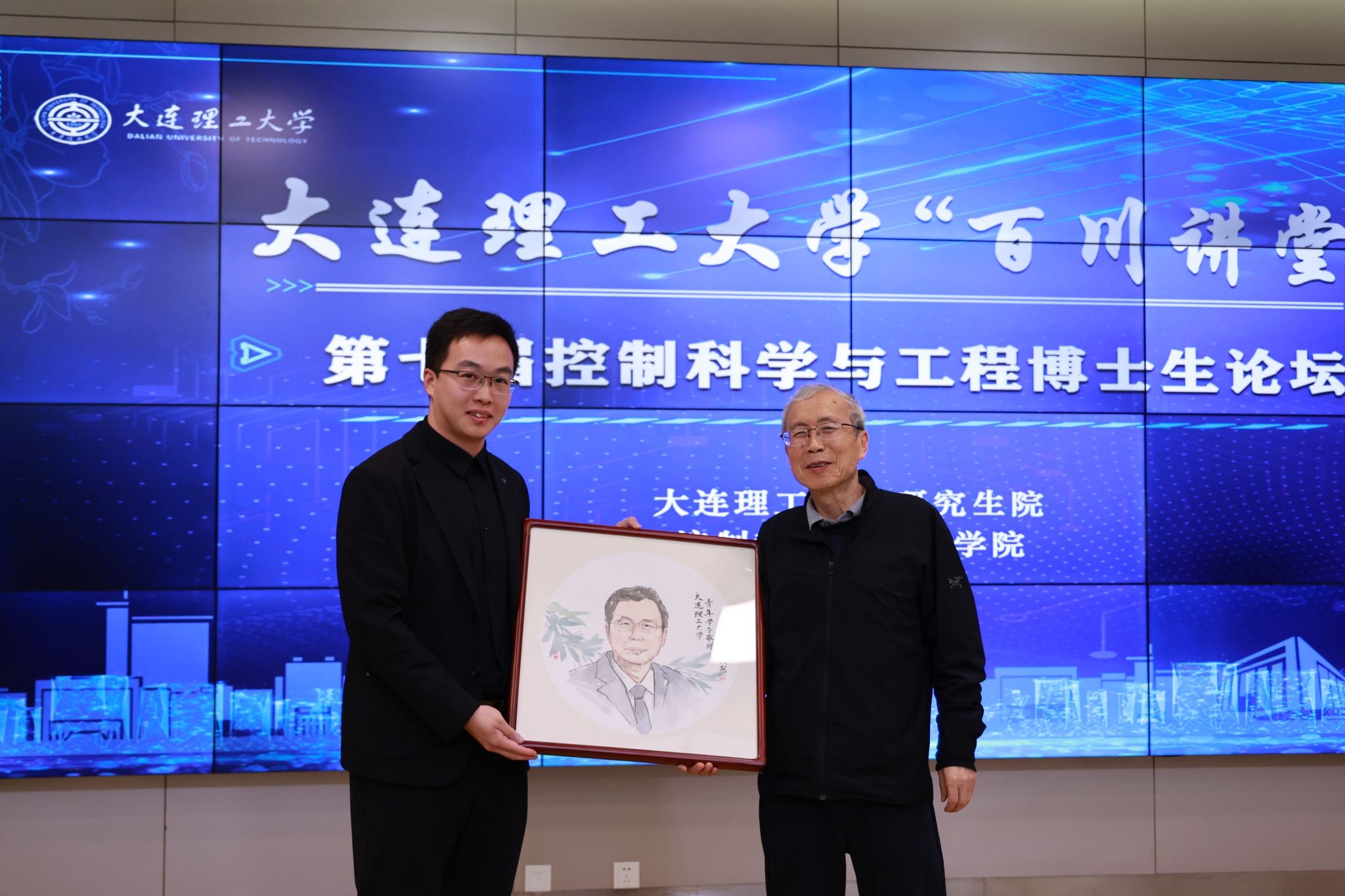 吴玉虎代表学校为桂卫华颁发“百川讲堂”纪念牌,学生代表赠送国画肖像,以表感谢与敬意。