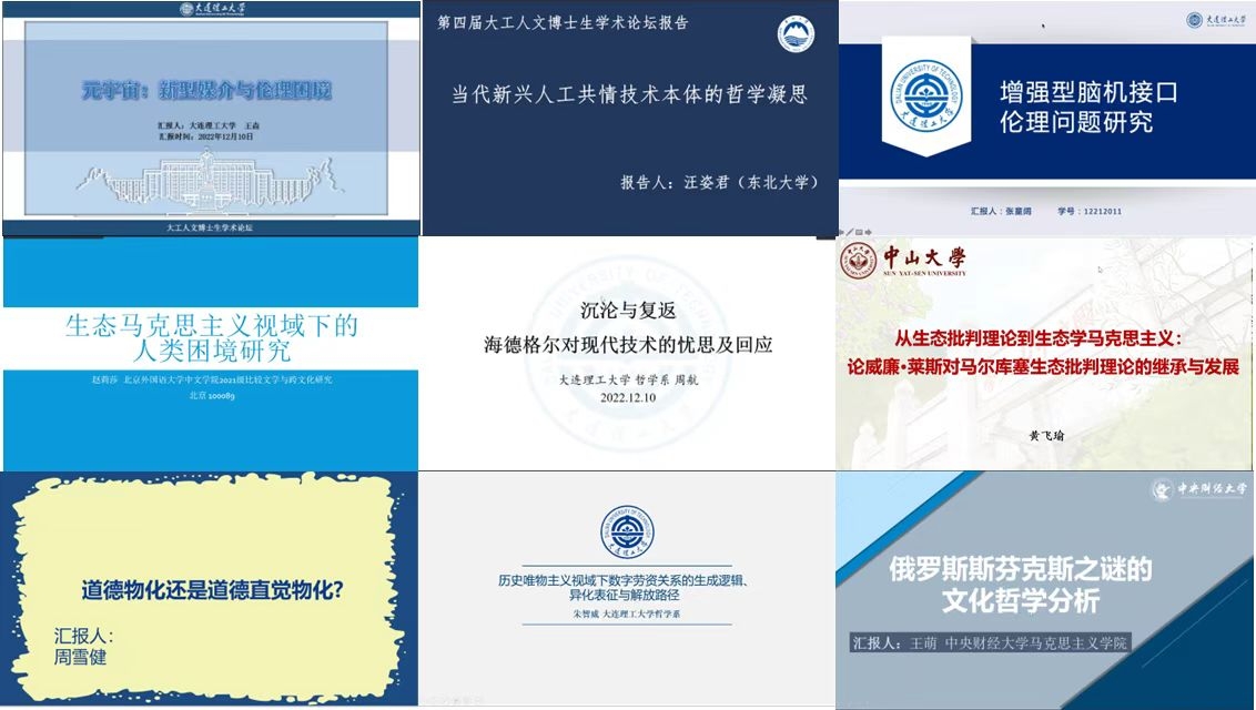 为深入贯彻落实党的二十大报告关于着力造就创新拔尖人才的重要精神,加快构建中国特色哲学社会科学学科体系、学术体系、话语体系,培育壮大哲学社会科学人才队伍,进一步拓宽研究生学术视野。12月10日,第四届大工人文博士生学术论坛于线上召开。学校研究生院副院长、党委研究生工作部部长张远航教授,人文与社会科学学部党委书记李鹏教授,党委研究生工作部副部长、研究生院团工委书记胡丰彦,人文学部党委副书记、副部长刘精晶,人文学部部长助理陈高华教授出席开幕会,论坛由哲学一级学科博士学位点负责人王前教授主持。来自清华大学、北京大学、上海交通大学等25所高校的百余位师生参会。