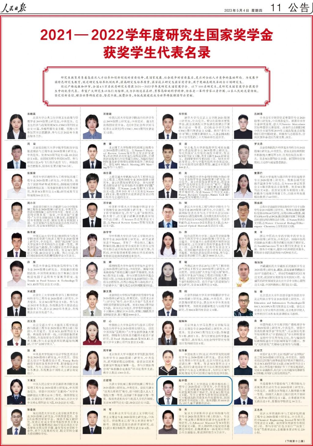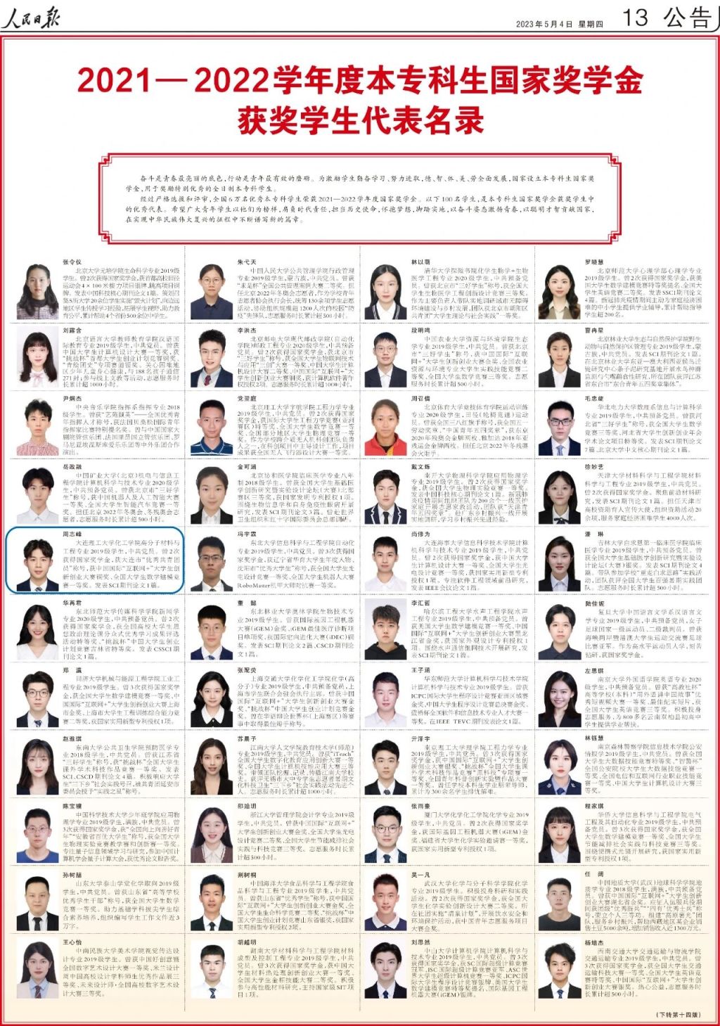 经过严格选拔和评审,全国4.5万名优秀研究生,6万名优秀本专科学生,荣获2021—2022学年度国家奖学金。5月4日出版的人民日报用多个整版刊登了100名研究生国家奖学金获奖学生优秀代表和100名本专科生国家奖学金获奖学生优秀代表名录,在这“万里挑一”的优秀代表中,有两位来自大工的同学!