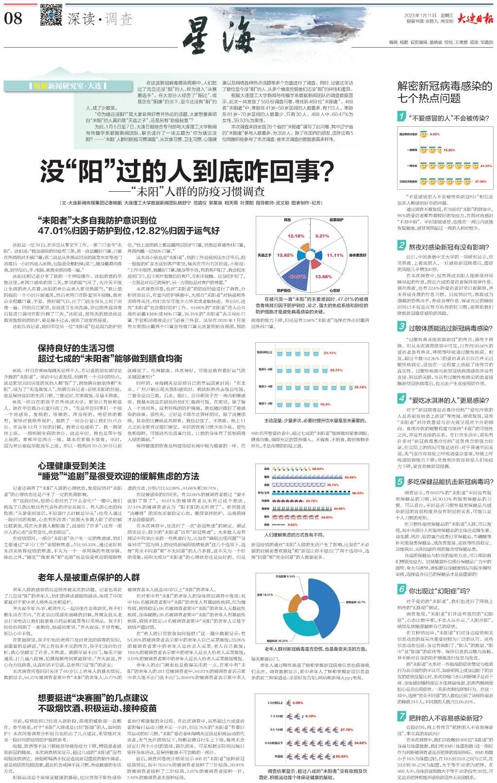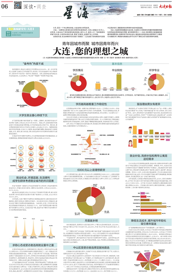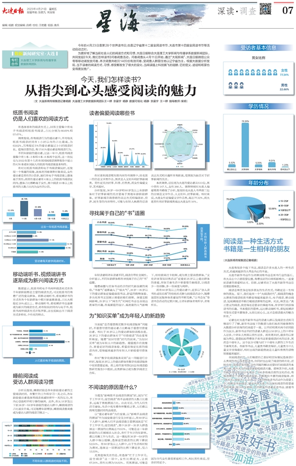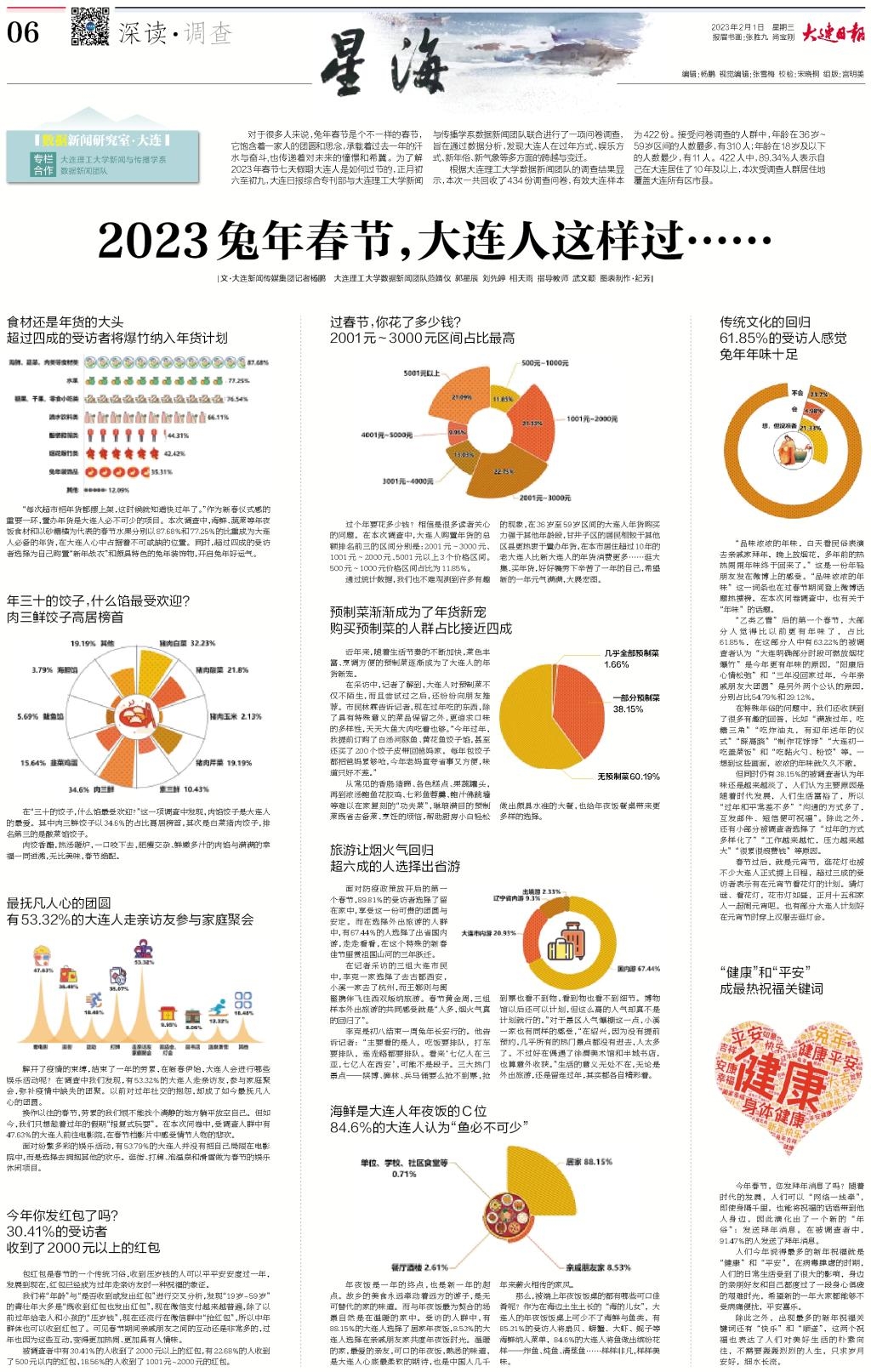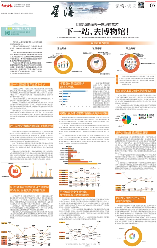 截至目前,数据新闻团队和大连日报已合作制作《没“阳”过的人到底咋回事?——“未阳”人群的防疫习惯调查》《2023兔年春节,大连人这样过……》《〈你的样子:为雷锋画像〉大型融媒体数据问卷调查报告》《今天,我们怎样读书?——从指尖到心头感受阅读的魅力》《因博物馆而去一座城市旅游——下一站,去博物馆!》《青年因城市而聚 城市因青年而兴——大连,您的理想之城》共6期数据新闻,发表于大连日报纸媒及大连日报官方微信公众号,并被新闻大连、大观新闻、半岛晨报、大工融媒等微信公众号及其他平台进行转载,获得阅读量累计超过10万人次。数据新闻团队以数据洞察社会细节,以图文丰富视觉体验,为大连日报宣传提供理论分析、科学调研及可视化制作,获得大连新闻传媒集团的高度认可。