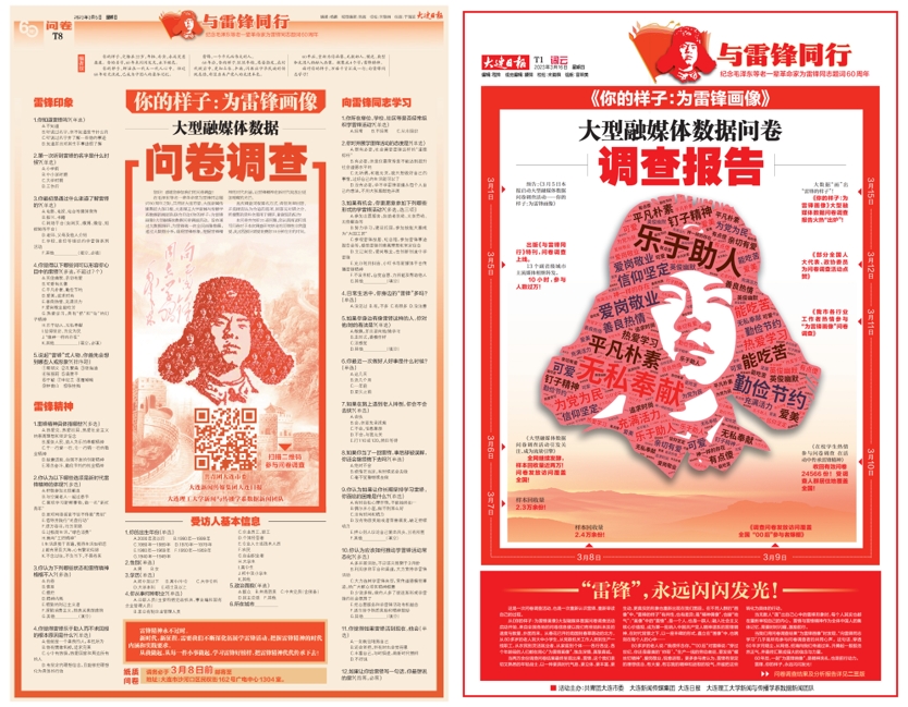 其中,于全国“学雷锋日”之前进行的“为雷锋画像”大型融媒体调查上线后,获13个副省级城市主流媒体相继转发,10小时后参与人数过万,全网收回有效问卷24566份,受调查人群居住地覆盖全国,受调查人群覆盖老年群体到大中小学生的各年龄段,获得全国人大代表、政协委员的点赞。