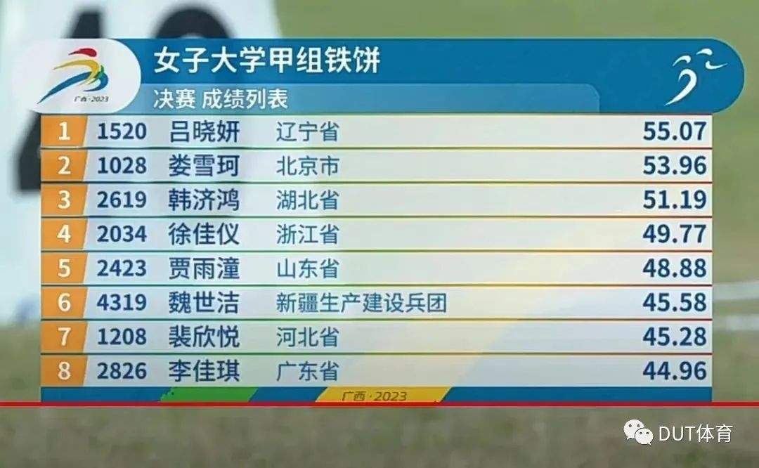 近日,由教育部、国家体育总局、共青团中央共同主办,广西壮族自治区人民政府承办,由原全国学生运动会和全国青年运动会合并而成的首届全国学生(青年)运动会在广西南宁开幕。在女子大学甲组铁饼决赛中,我校多名高水平运动员奋勇拼搏,代表辽宁省再创历史性成绩。11月11日,我校高水平运动员吕晓妍同学凭借55.07米的成绩,完美一掷,锁定胜局,为辽宁省代表团夺得本次赛事首金,再次刷新我校高水平运动员的成绩纪录。