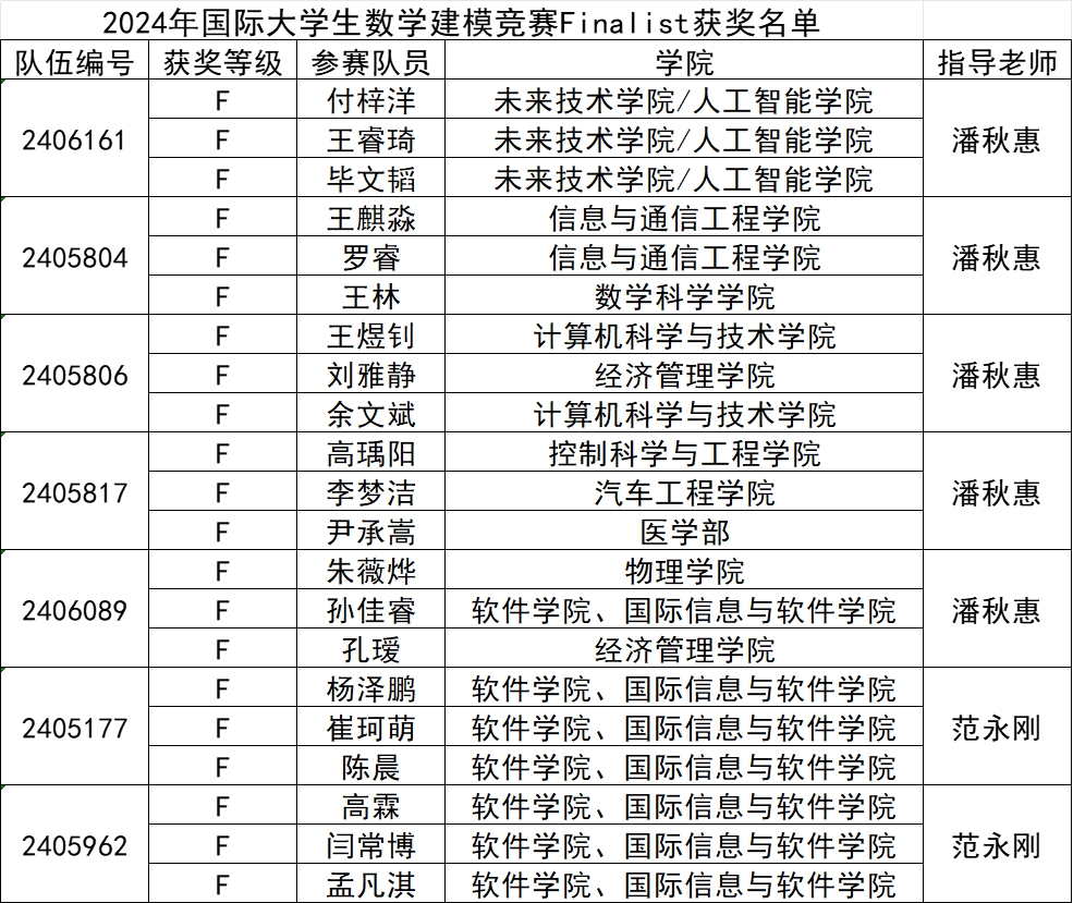 近日,2024年国际大学生数学建模竞赛成绩揭晓。我校学子获得特等奖提名奖(Finalist)7项,一等奖(Meritorious Winner)17项,取得历史最好成绩。