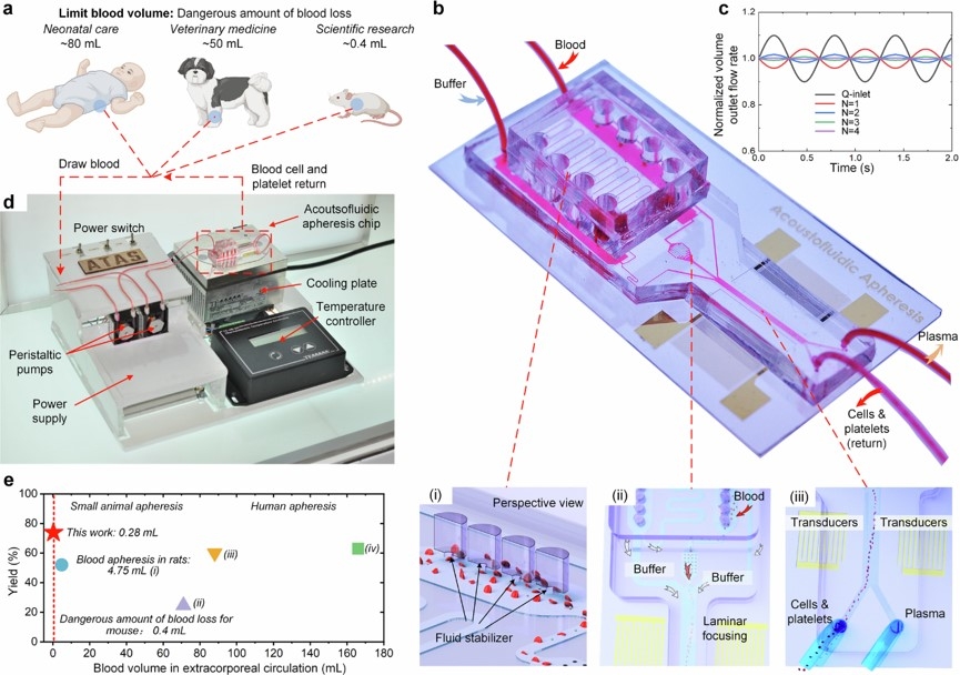 本项研究利用声流控技术开发了首款集成、精密、微型的治疗性血液成分单采系统,将设备的血液需求量降低了三个数量级。针对婴幼儿等血液总量少、器官和免疫系统脆弱的特殊患者,本研究的成果有望为临床治疗提供可行的方案。此外,本研究开发的基于声流控的治疗性血液成分单采系统同样适用于动物模型,为生命科学及医学相关领域的研究开辟了新的方法,也将进一步推动治疗性血液成分单采技术的发展。