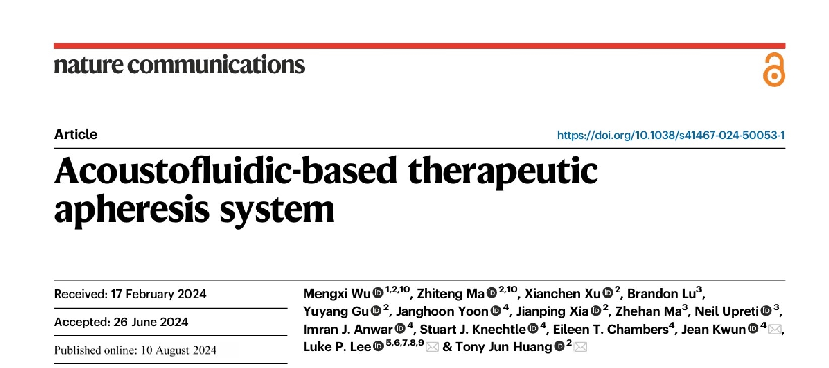 近日,机械工程学院吴梦希教授与杜克大学医院器官移植中心Jean Kwun教授、哈佛大学医学院Luke Lee教授、杜克大学机械工程与材料科学学院黄俊(Tony Jun Huang)教授等合作,在《自然·通讯》(Nature Communications)发表题为“基于声流控的治疗性血液成分单采系统(Acoustofluidic-based therapeutic apheresis system)”的研究论文。