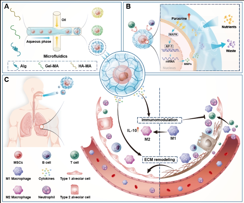 干细胞治疗的最新进展表明,静脉输注干细胞具有治疗危及生命的肺纤维化的潜力。然而,它也面临着局限性,如缺乏对细胞功能的控制和植入后宿主的快速清除。这项研究中开发了一种创新的PF治疗方法,通过气管给药的微流体模板化的干细胞微胶囊,有效地逆转了炎症和纤维化损伤的进展。研究结果显示了水凝胶微胶囊化可以增强供体间充质干细胞(MSCs)在宿主体内的持久性,同时驱动MSCs显著增强其治疗功能,包括免疫调节和基质金属蛋白酶(MMP)介导的细胞外基质(ECM)重塑。微胶囊通过激活了MSCs中的MAPK信号通路,增加MMPs的表达,从而降解纤维化肺中积累的过表达胶原。研究结果证明了水凝胶微胶囊通过细胞-物质相互作用增强间充质干细胞治疗效果的潜力,为设计纤维化疾病的先进干细胞疗法提供了一种有前景且直接的策略。