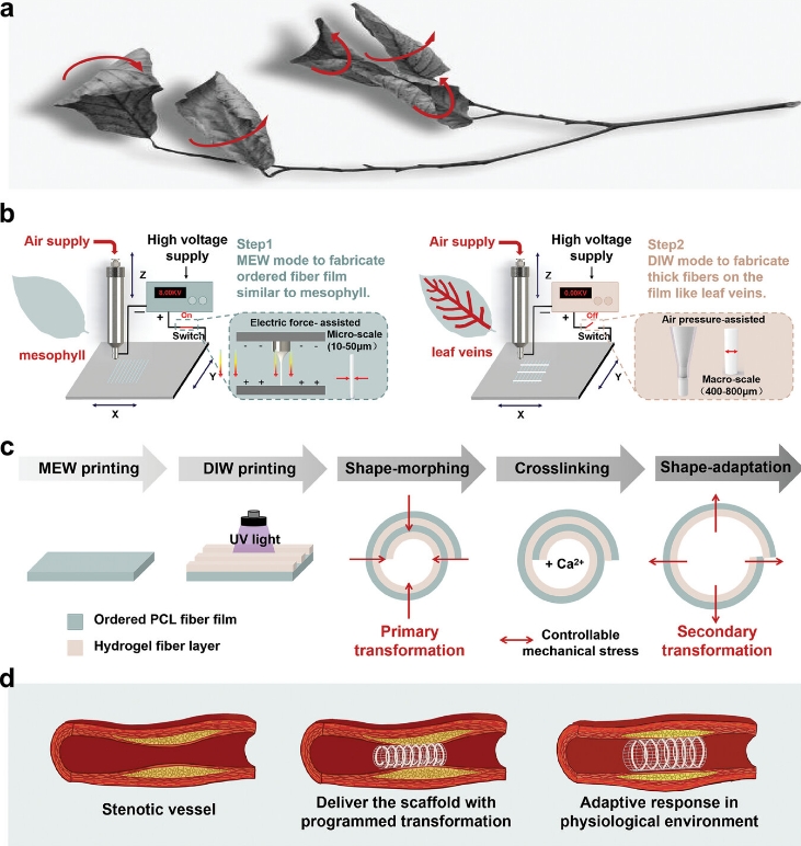 近日,我校生物工程学院王华楠教授团队根据许多枯萎的叶子或花朵在脱水后自发卷曲,从扁平结构转变为管状结构的自然现象,开发了一种创新策略来设计刺激响应支架,该支架能够从扁平的2D结构可编程地转换为各种卷曲的3D组织模拟结构。团队以该研究为基础,在工程技术与材料领域Top期刊《先进功能材料》(Advanced Functional Materials)上发表题为《仿生设计的4D打印可变形支架用于血管组织工程构建》(Bio-inspired Design of 4D-printed Scaffolds Capable of Programmable Multi-step Transformations toward Vascular Reconstruction)的研究论文。论文第一单位为我校生物工程学院,王华楠教授为论文通讯作者,第一作者为我校博士生王启帆。