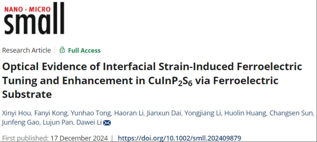鉴于此,李大卫教授团队采用光致发光(PL)光谱、压电力显微镜(PFM)和密度泛函理论(DFT)计算相结合的方法,阐明了基于铁电衬底的界面应变诱导CIPS中铁电调控与增强。PFM测试发现,薄层CIPS纳米片形成了与PZT和P(VDF-TrFE)铁电薄膜相同的畴结构,表明通过铁电衬底增强了CIPS的极化取向。PL光谱结合DFT计算分析显示,与在一般衬底上CIPS相比,在铁电衬底上CIPS的PL发射峰出现了显著的红移(高达0.21eV),从而揭示了界面拉伸应变诱导的CIPS晶格变化。通过比较分析PZT和CIPS/PZT上的单层MoS2的PL光谱,证明了CIPS的极化取向与铁电衬底的极化取向是反向对齐关系。原位变温PL光谱研究表明,在铁电衬底上的薄层CIPS表现出增强的TC(>200℃)。相关研究成果以“基于铁电衬底的界面应变诱导CuInP2S6中铁电调控与增强的实验证明”(Optical Evidence of Interfacial Strain-Induced Ferroelectric Tuning and Enhancement in CuInP2S6 via Ferroelectric Substrate)为题,发表在《微尺度》(Small)(2024,2409879.影响因子:13.0),硕士生侯心怡为第一作者,李大卫教授为通讯作者。