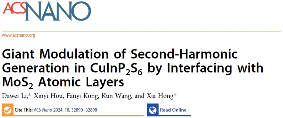 鉴于此,我校李大卫教授团队与美国内布拉斯加林肯大学洪霞教授团队合作,率先在CIPS及其与单层MoS2异质结构中观察到巨大且可调的二次谐波(SHG)响应。研究表明,CIPS在从少层到块体的厚度范围内均表现出强烈的SHG响应,且各向异性显著,表明其非中心对称结构的有效性。通过与单层MoS2形成异质结界面,实现了对CIPS中SHG响应的强调控,表明CIPS/二维半导体异质结构在非线性光学应用中的巨大潜力。通过结合偏振、温度和厚度依赖的SHG和光致发光光谱分析,揭示了CIPS/MoS2异质结构中SHG信号的调控机制主要来源于光吸收介导界面耦合,而非材料极性对称性,这一发现为理解和设计新型非线性光电材料与器件提供了新视角。相关研究成果以“单层MoS2界面诱导范德华层状铁电CuInP2S6二次谐波响应巨大调控”(Giant Modulation of Second-Harmonic Generation in CuInP2S6 by Interfacing with MoS2 Atomic Layers)为题发表在《美国化学学会纳米杂志》(ACS Nano)(2024,18,32890.影响因子:17.1),光仪学院硕士生侯心怡为(除导师外)第一作者,李大卫教授、洪霞教授为通讯作者。
