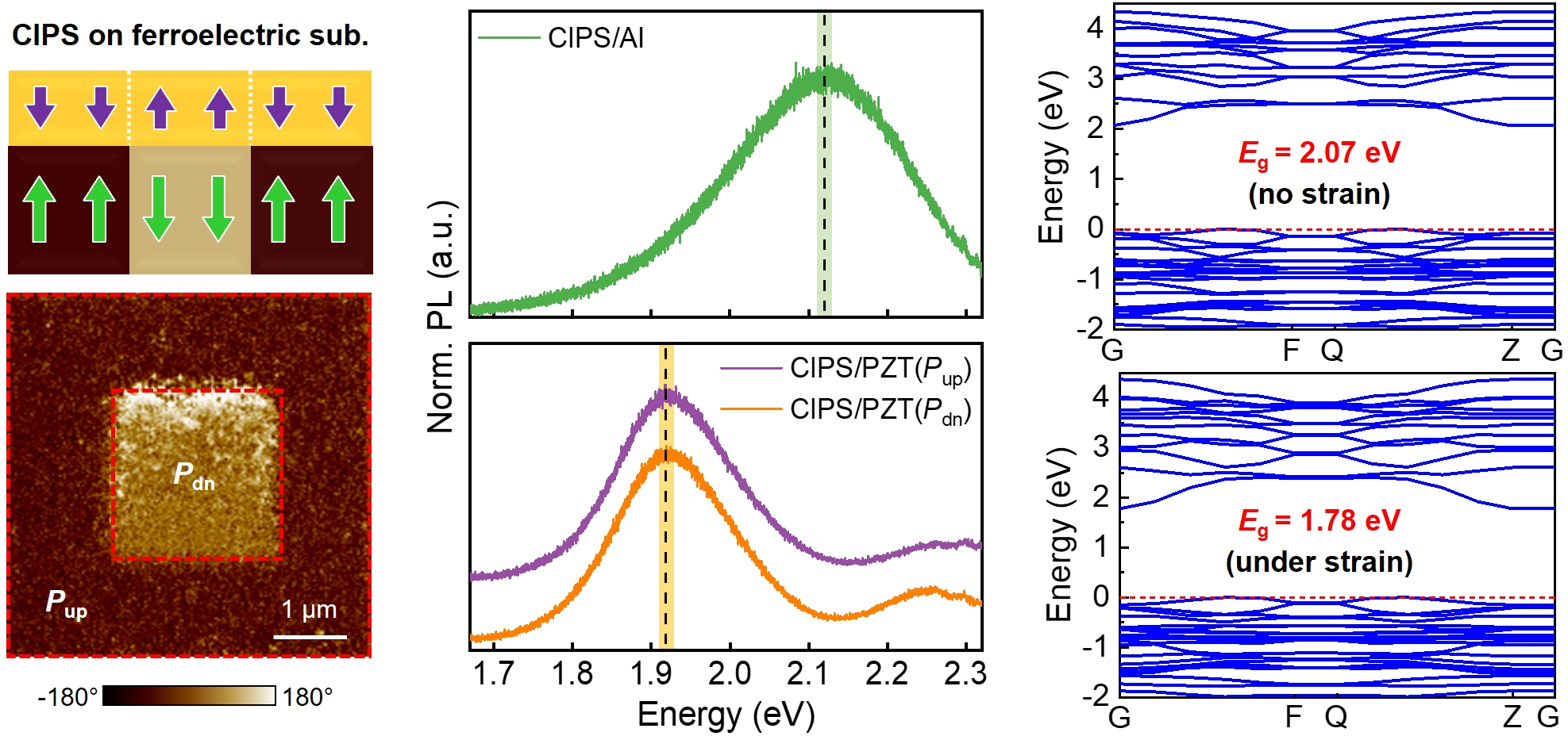 另外,vdW层状铁电材料CIPS作为室温铁电绝缘体,具有直接宽带隙(≈2.9eV)、较高居里温度(TC≈320K)和大的面外极化(≈4.15μC/cm2)等特性,其独特结构使其在新型纳米电子和纳米光子器件中极具应用潜力。然而,在CIPS中,由于Cu离子的移动,外部电场驱动的畴写入会产生不稳定的畴和扩散的畴壁,甚至导致材料击穿,阻碍了其在极化依赖器件中的应用。因此,在CIPS等层状铁电材料中实现精确的畴控制仍然是一个挑战。一种有效策略是通过将CIPS与铁电氧化物薄膜形成界面来控制CIPS的畴形成,但其背后的铁电调控机制尚不明晰,特别是缺乏实验证据来证明界面应变诱导的结构畸变效应。
