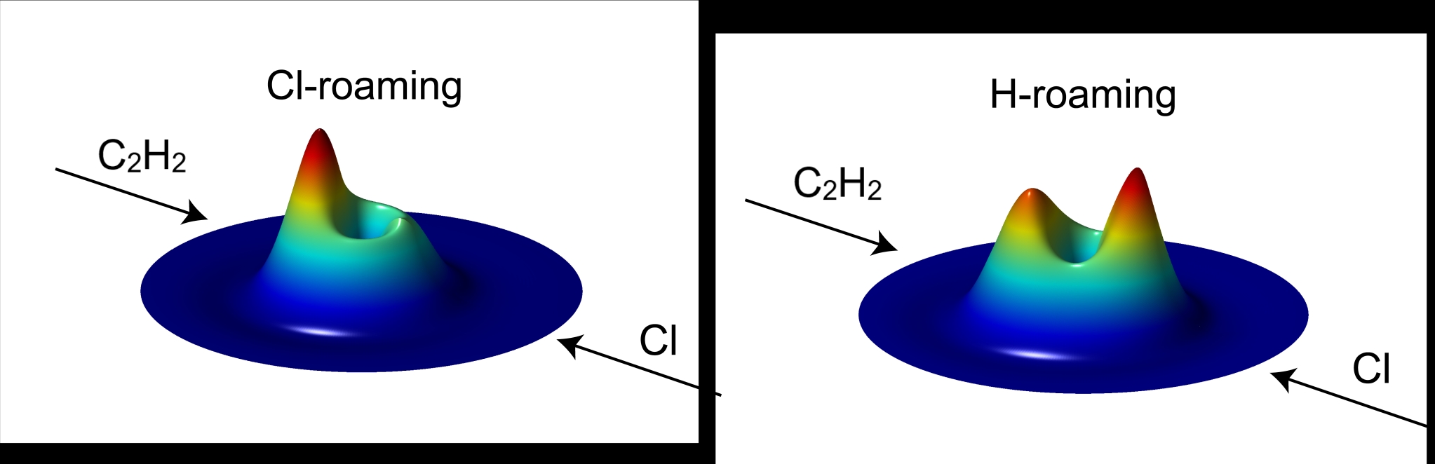 研究人员通过构建高精度全维基态势能面,并在此基础上对Cl+C2H2→HCl+C2H反应开展了可靠的动力学计算工作。研究结果表明,在该碰撞反应中除经传统过渡态结构的直接抽取路径,还存在氯漫游(Cl-roaming)和氢漫游(H-roaming)两种漫游机制。在氯漫游机制中,入射的氯原子与乙炔分子碰撞后会形成络合物中间体(C2H2Cl),随后氯原子从络合物中部分解离并在乙炔分子附近漫游,最终抽取其上氢原子形成氯化氢分子。而在氢漫游机制中,氢原子率先从形成的络合物中间体中脱离,并在络合物附近迁移漫游,进而从中提取Cl原子生成产物。