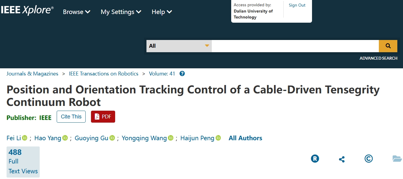 近日,力学与航空航天学院力学系、工业装备结构分析优化与CAE软件全国重点实验室彭海军教授团队,在机器人动力学与控制基础研究方面取得突破性进展,成果“绳驱张拉连续型机器人的位姿跟踪控制”(Position and orientation tracking control of a cable-driven tensegrity continuum robot)在机器人专业顶级期刊《IEEE机器人汇刊》(IEEE Transactions on Robotics,TRO)上发表论文。这是以我校为第一单位在该期刊上发表的首篇学术论文。