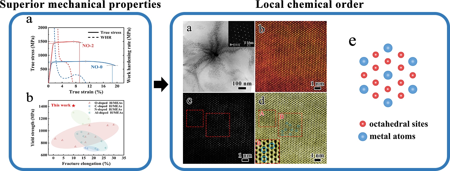 难熔高熵合金在高温条件下优异的抗软化性与相稳定性,使其成为航空航天、核能与高应力环境应用的理想材料。然而,该类合金仍面临诸多挑战,主要源于其较低的强度或固有脆性。尤其是经典的TiZrHfNb体系,尽管具有良好的延展性,但其屈服强度不足1GPa,始终难以满足严苛的工程应用需求。基于对难熔高熵合金成分局部化学波动的相关研究,有意掺杂小尺寸间隙原子以设计局部化学有序为克服合金的强度-延展性权衡提供了一种新方法。为解决单类型间隙原子掺杂策略的固有局限性,该研究创新性提出“氧-氮协同效应”的强化策略,形成独特的“有序-无序”结构耦合:其中,氧原子在(Ti, Zr)-富集区域构建局部化学有序结构,为滑移面上的位错提供低能垒成核位点,促进位错增殖,改善合金延展性;而氮原子则通过强烈的晶格畸变效应抑制位错长程滑移,有效提升合金强度。基于“氧-氮协同效应”设计的模型合金的屈服强度显著提高,为1412.9±13.5MPa,与TiZrHfNb合金相比提高了92%,同时保持了10%的断后伸长率。该强化方法为提升其他体心立方结构难熔高熵合金强度提供了全新的范式。