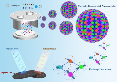 此外,高速武器装备在高温环境中的隐身要求对高温微波吸收材料提出了更高的温度适应性要求。在高温吸收剂方面,传统的单主元素合金依赖于添加高比例钴、铁等磁性金属提升居里温度,但这会导致电导率升高,引发高温下的阻抗失配和电磁波反射问题。段玉平教授研究团队通过协同策略设计高熵合金,诱导了强的d-f轨道交换相互作用,实现优异的高温磁性能和磁损耗。最新成果以“策略诱导的强交换相互作用,以增强高熵合金粉末的高温磁损耗”(Strategy-inducedstrong exchange interaction for enhancing high-temperature magnetic loss in high-entropy alloypowders)为题进行发表。