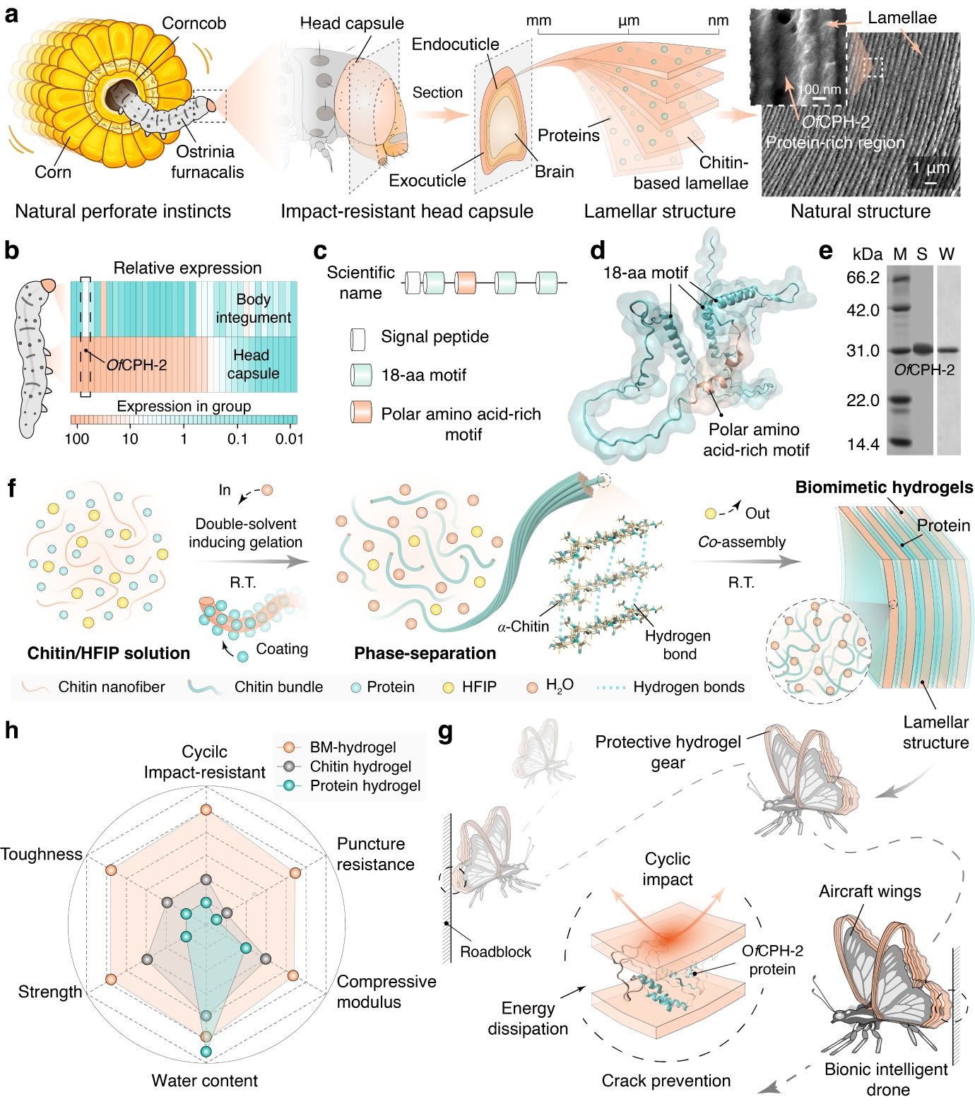 本文对其头壳内层表皮中高丰度、特异性表达的表皮蛋白OfCPH-2进行了体外表达和功能分析,并通过二元溶剂交换法制备了一种由几丁质和OfCPH-2构成的仿生水凝胶。研究发现,OfCPH-2能够合理调控几丁质水凝胶的层状结构形成并实现多尺度能量耗散机制协同作用,从而实现前所未有的超强抗冲击性(约23,534 J·m-2,比单纯几丁质水凝胶提高了1,032倍)。这种结构与头壳内层表皮中的层状结构相似,使其在局部机械应力下具有卓越的稳定性。后续研究证实,在无人机等需要承受反复机械冲击和意外碰撞的应用场景中,该仿生表皮材料可作为关键防护层提升机体安全性和作业可靠性,并有望进一步拓展至电子与传感器件的耐冲击防护层,以及对耐冲击性能有严格需求的机器人等领域。