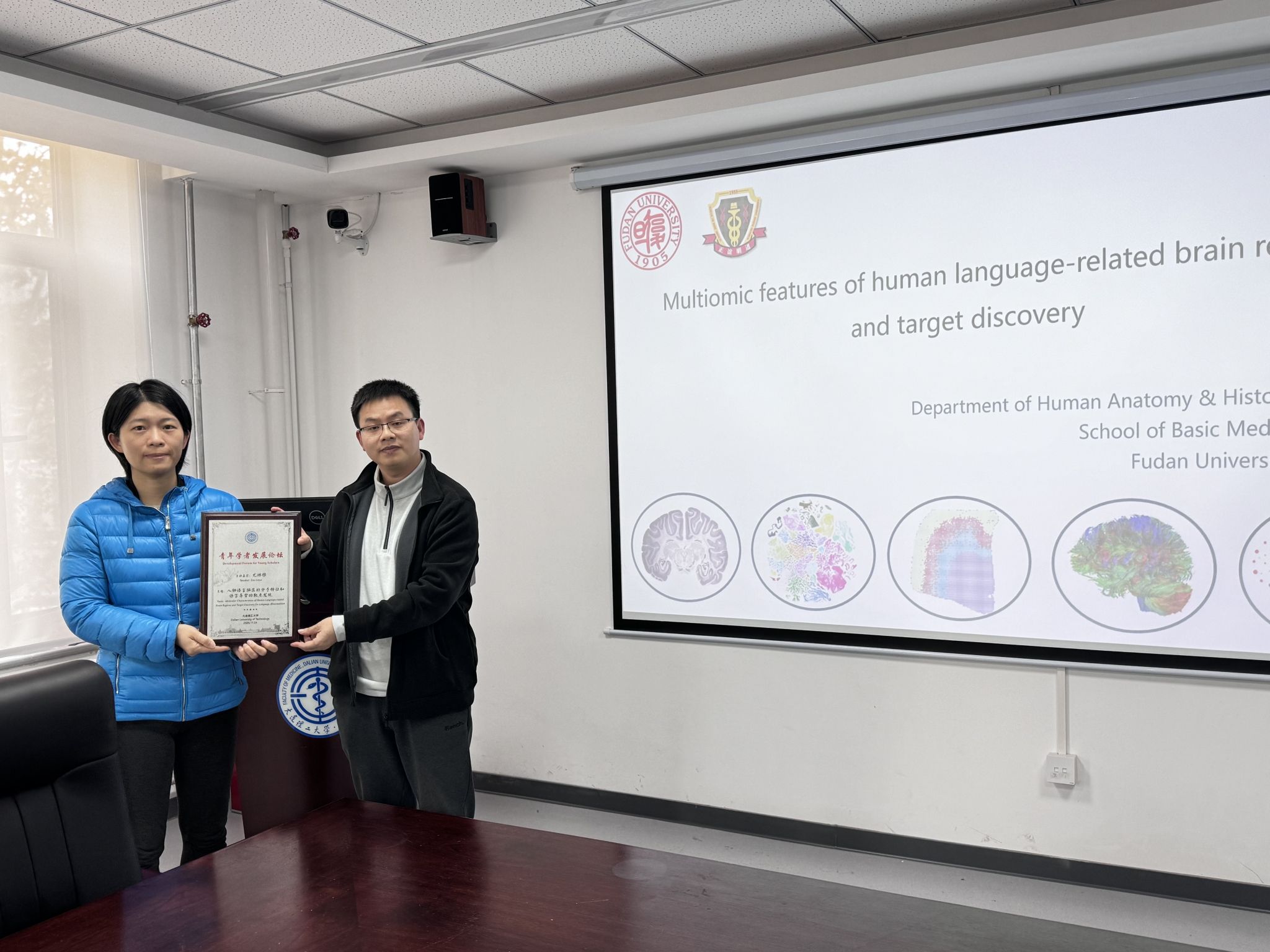 李林为尤琳雅颁发大连理工大学“青年学者发展论坛”纪念铭牌。本次活动的成功举办,为我校师生搭建了高质量的学术交流平台,有效拓展了相关领域的研究视野,为促进我校与复旦大学在基础医学领域的深度合作搭建了重要桥梁。