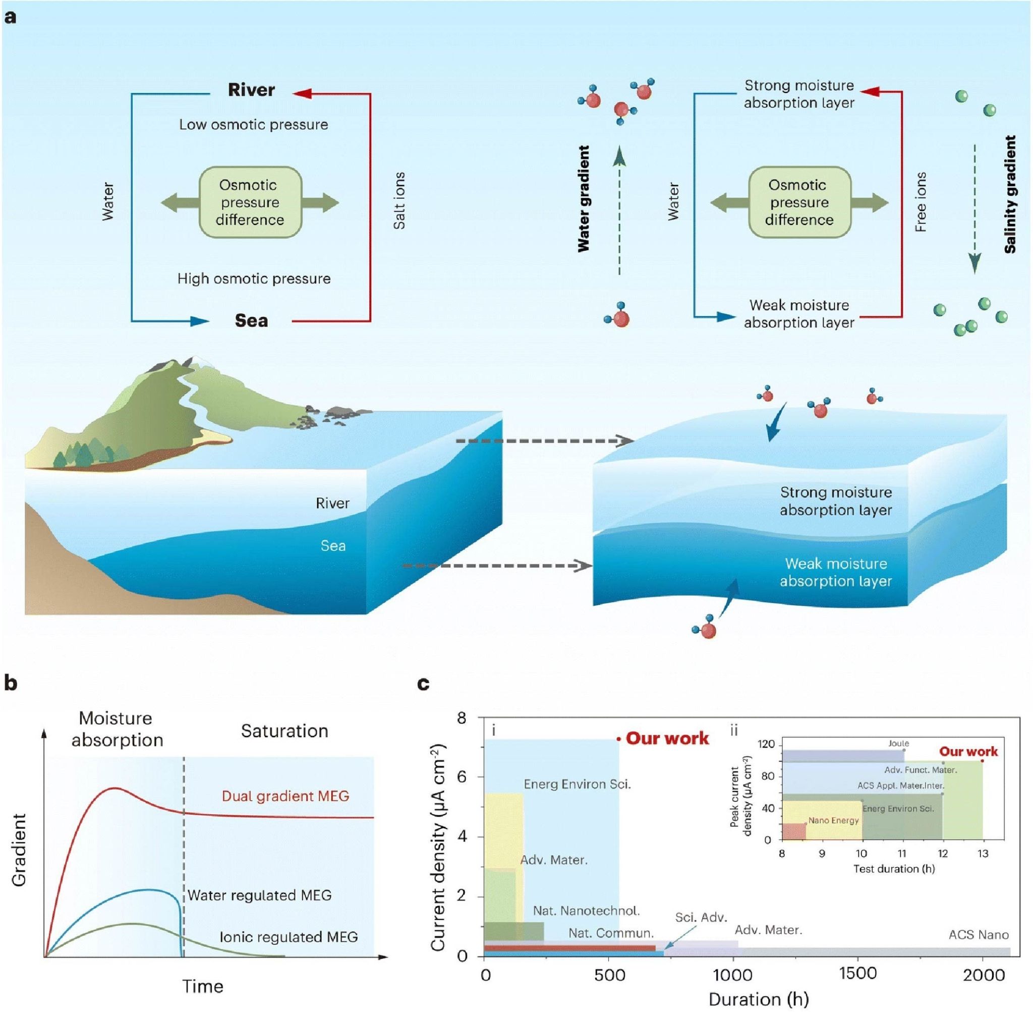 水伏发电技术基于自然界水文循环中的水分迁移与相变过程进行能量转换,是面向分布式可再生能源的重要发展方向。与依赖太阳辐照或风力资源的技术不同,水伏发电利用大气湿度梯度、蒸发–冷凝、降雨渗透、自然水流及植物蒸腾等常态化水分输运过程,通过水分化学势差驱动离子迁移,实现近全天候、全地域的能量获取。水文循环所涉及的蒸发潜热与水分迁移能量规模远高于全球年能源消耗总量,理论开发潜力巨大。然而,该技术长期面临输出电流密度低、工作温域受限等关键瓶颈,制约其规模化应用。