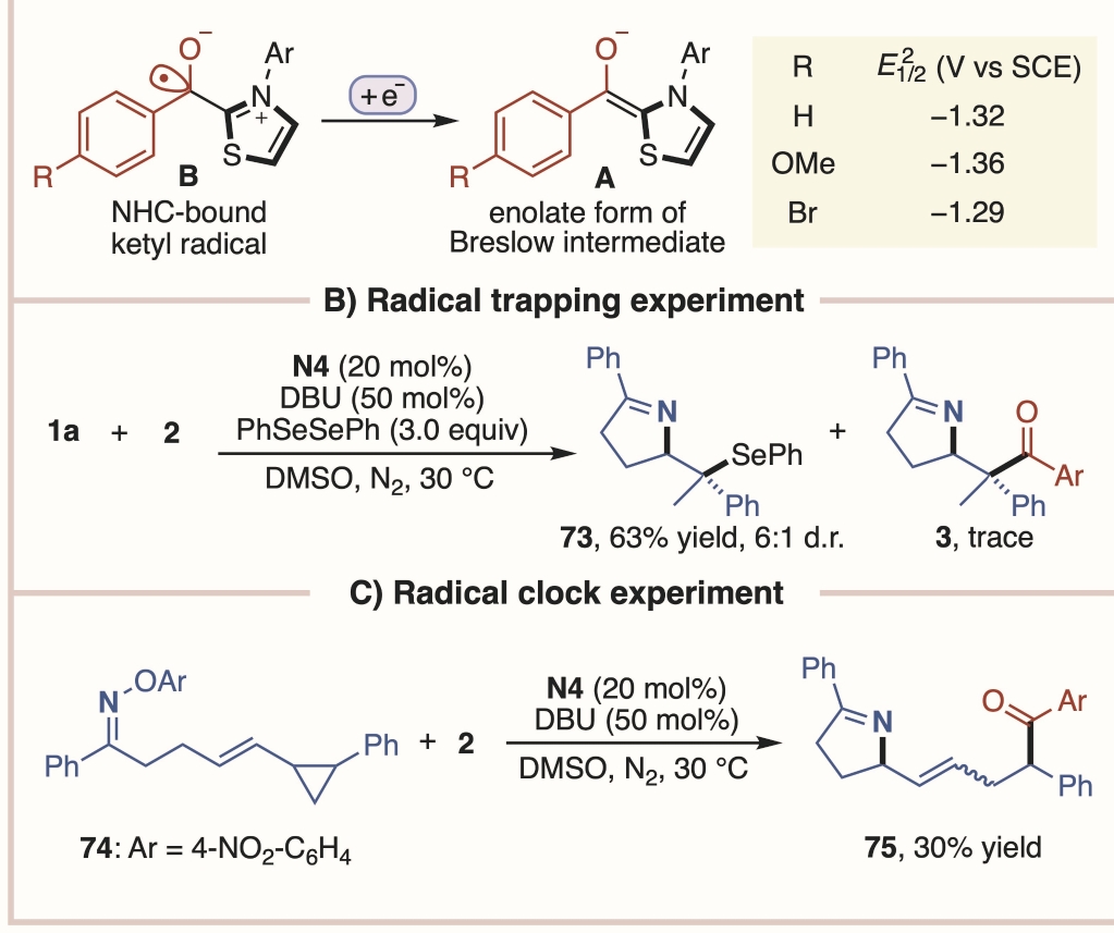 为了深入了解反应机制,研究人员进行了充分的机理验证实验。通过电化学方法,测定了Breslow中间体的氧化电势,阐明这一基态单电子转移是一放热过程(ΔGSET≈−5 kcal mol1)。通过自由基捕获及自由基钟实验,证明了自由基环化反应过程。另外,详尽的DFT计算结果表明自由基-自由基偶联过程是反应的决速步骤,而自由基中间体的π-π堆积作用是控制反应立体选择性的关键。这一有机小分子催化体系,为进一步探索不对称自由基偶联反应奠定了基础。