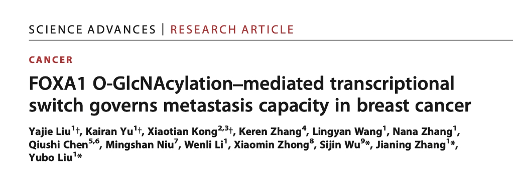 近日,我校生命科学与药学学院刘宇博/张嘉宁团队在线发表了题为“FOXA1 O-GlcNAcylation-mediated transcriptional switch governs metastasis capacity in breast cancer”研究论文。该研究成果揭示了O-GlcNAc糖基化修饰通过调控转录组重编程因子先驱因子FOXA1的染色质定位,改变细胞粘附相关多种下游基因表达,从而增强乳腺癌的转移等恶性表型的新机制。