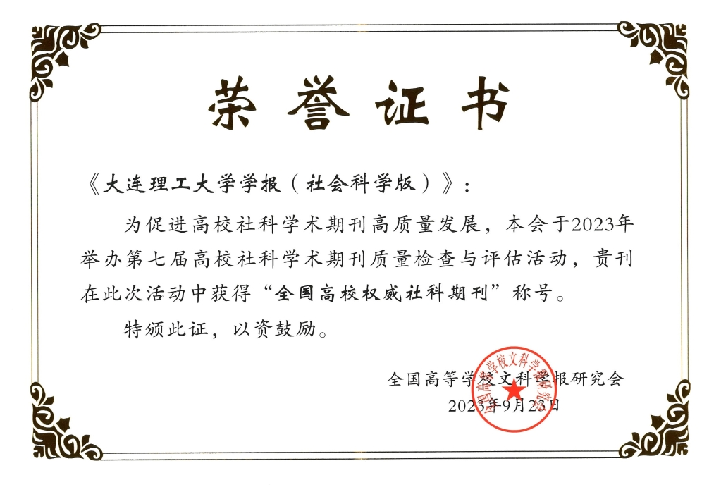 《大连理工大学学报(社会科学版)》此次获评“全国高校权威社科期刊”,是继2014年“全国高校百强社科期刊”、2019年“全国高校社科精品期刊”后获得的又一荣誉,说明了《大连理工大学学报(社会科学版)》办刊质量和学术影响力得到了学术界与期刊界的高度认可,也说明了《大连理工大学学报(社会科学版)》在办刊质量上稳居全国同类期刊前列。