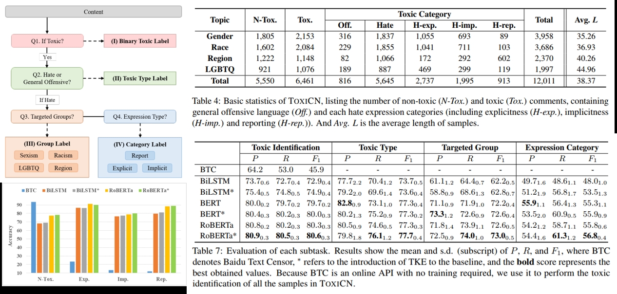 在社交媒体平台上,有毒言论的肆虐对社会造成了严重的危害。相较于英文,中文有毒言论检测的相关研究明显滞后。现有的数据集缺乏对有毒言论的毒性类型和表达方式进行细粒度注释,忽略了具有隐式毒性的样本。因此有必要促进了中文有毒言论的细粒度检测。首先,构建了Monitor Toxic Frame,这是一个层次的分类学框架,用于分析有毒类型和表达方式。然后,提出了一个细粒度的中文有毒言论数据集ToxiCN,包括显式毒性和隐式毒性样本。还构建了包含隐性亵渎的侮辱性词典,并提出了Toxic Knowledge Enhancement (TKE)结合词汇特征来检测有毒言论。在实验阶段,验证了TKE的有效性,并对研究结果进行了系统的定量和定性分析。