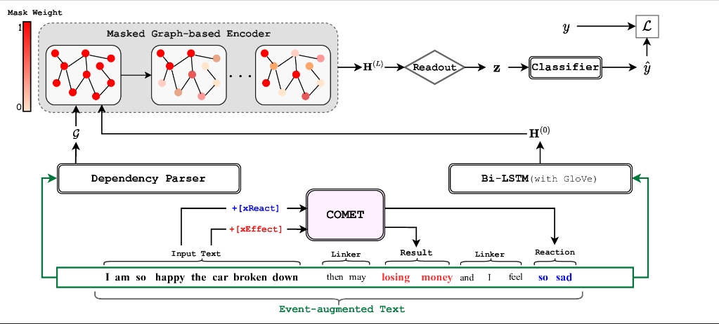受人类对于讽刺的认知过程的启发,提出了一种潜在结果与心理反应增强的讽刺检测方法。基于认知语言学中The Direct Access理论,将每个讽刺样本视为一个不完整的版本,缺少与隐式负面情景相关的信息,这些信息包括讽刺样本可能引起的可能结果以及听众的心理反应。为此,利用预训练外部常识推理工具COMET,在[xEffect]和[xReact]关系的引导下,进一步推断每个反讽样本的可能结果以及心理反应。并在原始反讽样本的基础上,进一步构建增强样本。最后,利用降噪图编码器进一步学习增强样本的语义表示并得到样本预测结果。在四个不同规模的公开反讽识别数据集上进行实验,结果表明SD-APRR相比于最新基线模型有明显提升。此项研究工作同时说明在深度学习时代,传统语言学、心理学相关理论仍具有重要作用。