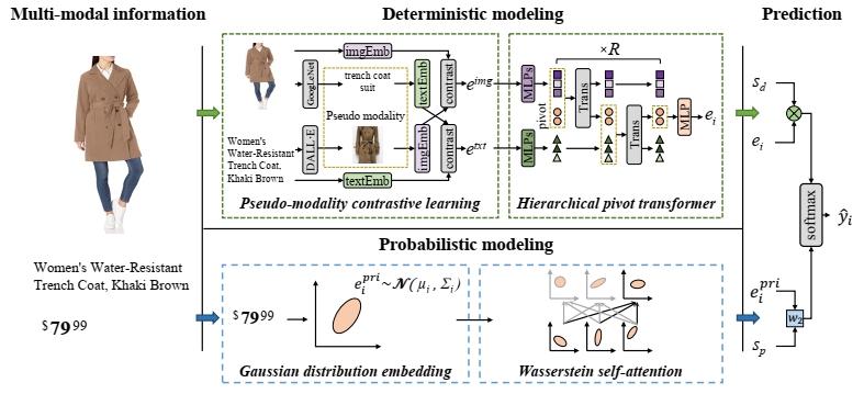 会话推荐旨在根据匿名用户短期行为序列预测用户偏好,进而为其提供个性化推荐服务。现有的会话推荐方法侧重于挖掘会话中由商品ID暴露的商品共现模式,而忽略了真正吸引用户与特定商品产生交互行为的是页面上展示的关于商品的多模态信息。这些多模态信息可以分为描述型信息(商品的图片和文本),数值型信息(商品的价格)。因此,论文提出了一个多模态会话推荐模型(MMSBR)对这些多模态信息进行统一建模,以便更好地理解用户意图,提升会话推荐的性能。具体而言,论文设计了一种伪模态对比学习来提升对商品图片和文本的表示学习;并提出了一种层次枢轴transformer来融合异构的图片和文本信息,进而表示商品的描述性特征。同时,采用高斯分布表示数值信息,设计了Wasserstein自注意力来处理价格对用户的概率影响模式。大量实验证明了所提出的MMSBR的有效性。进一步的分析也证明了MMSBR可以有效地缓解会话推荐中的冷启动问题。