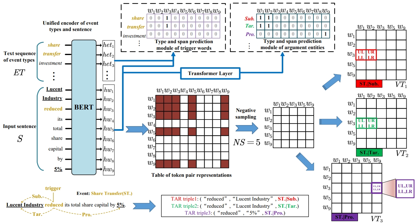 近年来,嵌套与重叠事件抽取受到了广泛关注。已有的研究主要关注于平事件的抽取,忽略了文本中广泛存在的嵌套与重叠事件。论文引入了目标检测框架来解决填表事件抽取任务,提出的一阶段事件抽取器叫做ODEE,可以解决嵌套与重叠事件抽取问题。论文所提的模型中包含基于目标区域顶点的标注方案和两个预测事件触发词和要元实体类型和边界范围的辅助任务,充分利用了事件元素的跨度信息。除此之外,在训练阶段,引入了表格单元的负采样方法来解决表格单元的正负样本不均衡的问题。该负采样策略在提升模型性能的同时提高了模型的计算效率。实验结果表明,ODEE在三个基准嵌套与重叠事件抽取数据集上取得了最佳性能(i.e., FewFC, Genia11, and Genia13)。与此同时,ODEE相比已有方法,取得了最快推理速度和最少参数量等,证明ODEE模型具有很高的计算效率。