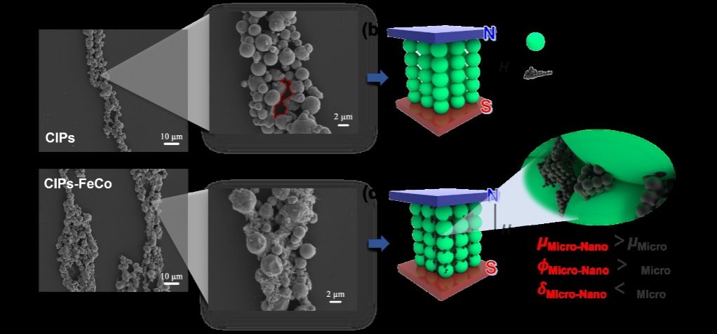 该研究团队基于跨尺度磁性颗粒开发了综合性能优异的磁流变液,实现了剪切屈服强度、沉降稳定性和零场粘度等关键性能指标的平衡。该研究采用直流电弧等离子体法制备具有高饱和磁化强度的FeCo纳米颗粒,将其与微米羰基铁颗粒按优化比例复配,构建一种新型的微纳米颗粒双分散磁流变液体系。相比于传统微米羰基铁粉磁流变液体系,微纳米颗粒双分散磁流变液体系的剪切屈服强度和沉降稳定性都得到了极大的提高,同时零场粘度和再分散性没有明显的劣化,剪切屈服强度从52 kPa提升到58.3 kPa,沉降稳定性从60.1%提升到82.6%,零场粘度仅从0.87 Pa·s升高到1.25 Pa·s,再分散性仅从1.3%增加到了1.5%。该研究完美地解决了目前磁流变液关键性能指标难以平衡的问题,为结构智能减振技术的应用提供了高性能的智能材料。