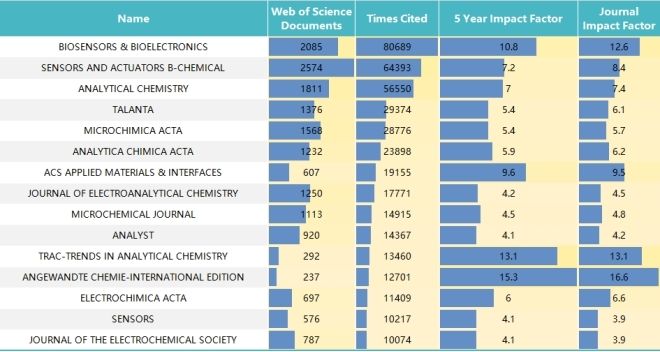 Biosensor研究共涉及2826种来源期刊,按期刊发文由高到低排序如下。
