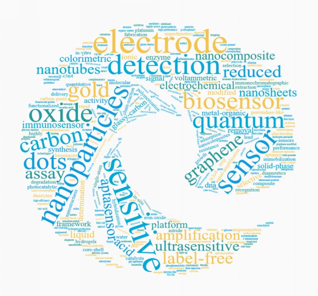 论文被引是判断论文价值的重要指标之一。Biosensor研究共有383篇高被引论文,高被引论文关键词词云图如下。高频关键词包括:SENSITIVE DETECTION、NANOPARTICLES、REDUCED GRAPHENE OXIDE、SENSOR、ELECTRODE、GOLD NANOPARTICLES、ULTRASENSITIVE DETECTION、QUANTUM DOTS、NANOCOMPOSITE、BIOSENSOR、ELECTROCHEMICAL SENSOR、IONIC LIQUID等。