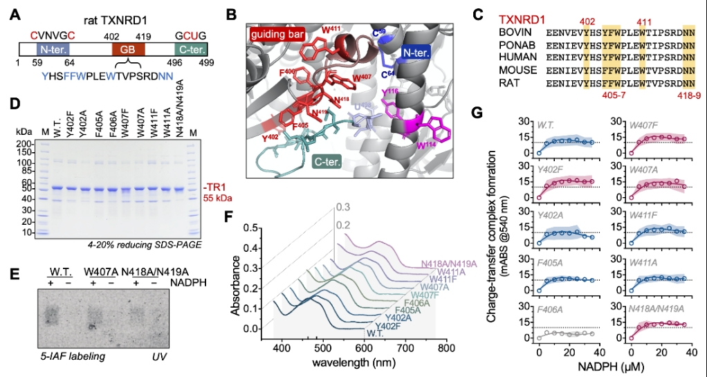 在氧化还原生物学领域里,细胞质型硫氧还蛋白还原酶是维持高等生物细胞内氧化还原平衡的关键硒酶,而导向杆基序在酶功能中发挥重要作用。前期研究发现,导向杆基序在空间上趋近硒酶羧酸端氧化还原模体,会影响到羧酸端活性、底物结合、抑制剂结合以及电子传递等。