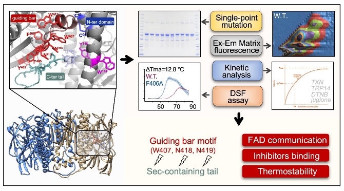 近日,化工海洋与生命学院许建强课题组在生物学领域顶刊《氧化还原生物学》(Redox Biology)发表题为 “细胞质型硫氧还蛋白还原酶的导向杆基序通过与辅因子FAD通讯来调节柔性羧酸端氧化还原基序实现酶活性调控和抑制剂结合” (Guiding bar motif of thioredoxin reductase 1 modulates enzymatic activity and inhibitor binding by communicating with the co-factor FAD and regulating the flexible C-terminal redox motif)的研究文章。2020级本科生时武阳、研究助理孙世博和2021级硕士生柳昊雯是共同第一作者,许建强副教授是唯一通讯作者。