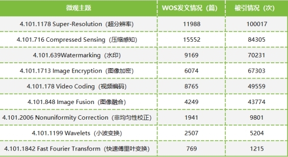 截至数据统计日期,安全、加密和编码(Security, Encryption & Encoding)覆盖的论文数量为61,014篇,总被引次数为431,409次,共涵盖9个微观主题,分别为:4.101.1178超分辨率(Super-Resolution)、4.101.716压缩感知(Compressed Sensing)、4.101.639水印(Watermarking)、4.101.1713图像加密(Image Encryption)、4.101.178视频编码(Video Coding)、