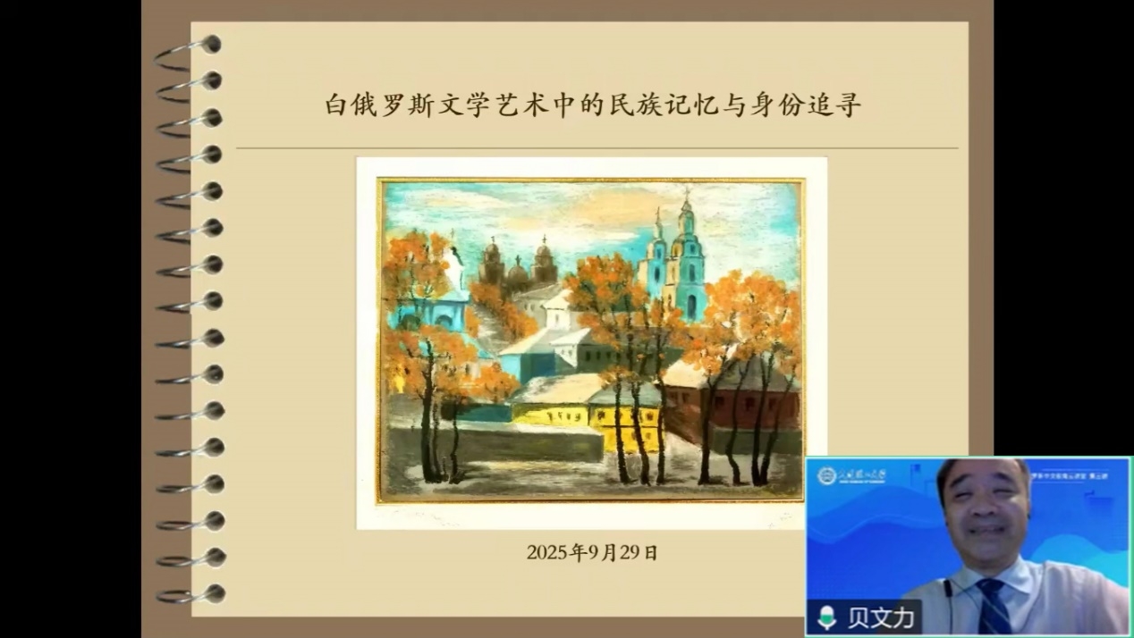 第三场讲座,华东师范大学白俄罗斯研究中心主任贝文力带来《白俄罗斯文学艺术中的民族记忆与身份追寻》。他以历史为线,梳理白俄罗斯文学与艺术发展脉络,通过赏析建筑、绘画、雕塑、纪念建筑群等艺术符号,介绍民族生活与斗争传统,让师生感受真实立体的白俄罗斯,理解人民对记忆的守护与身份的追寻。