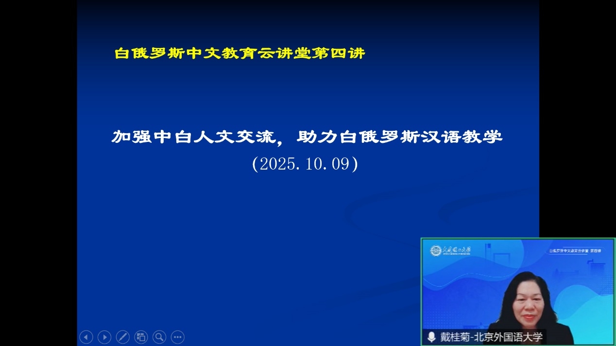 第四场讲座,北京外国语大学俄语学院院长戴桂菊带来《加强中白人文交流,助力白俄罗斯汉语教学》。她指出,随着中白关系持续深化,白俄罗斯汉语学习者数量快速增长,对课程、教材、师资和培养模式均提出新挑战。中白人文交流活动应作为汉语教学的“第二课堂”,助力国际中文教师师资培养,并为学习者搭建与中文母语者沟通的桥梁。