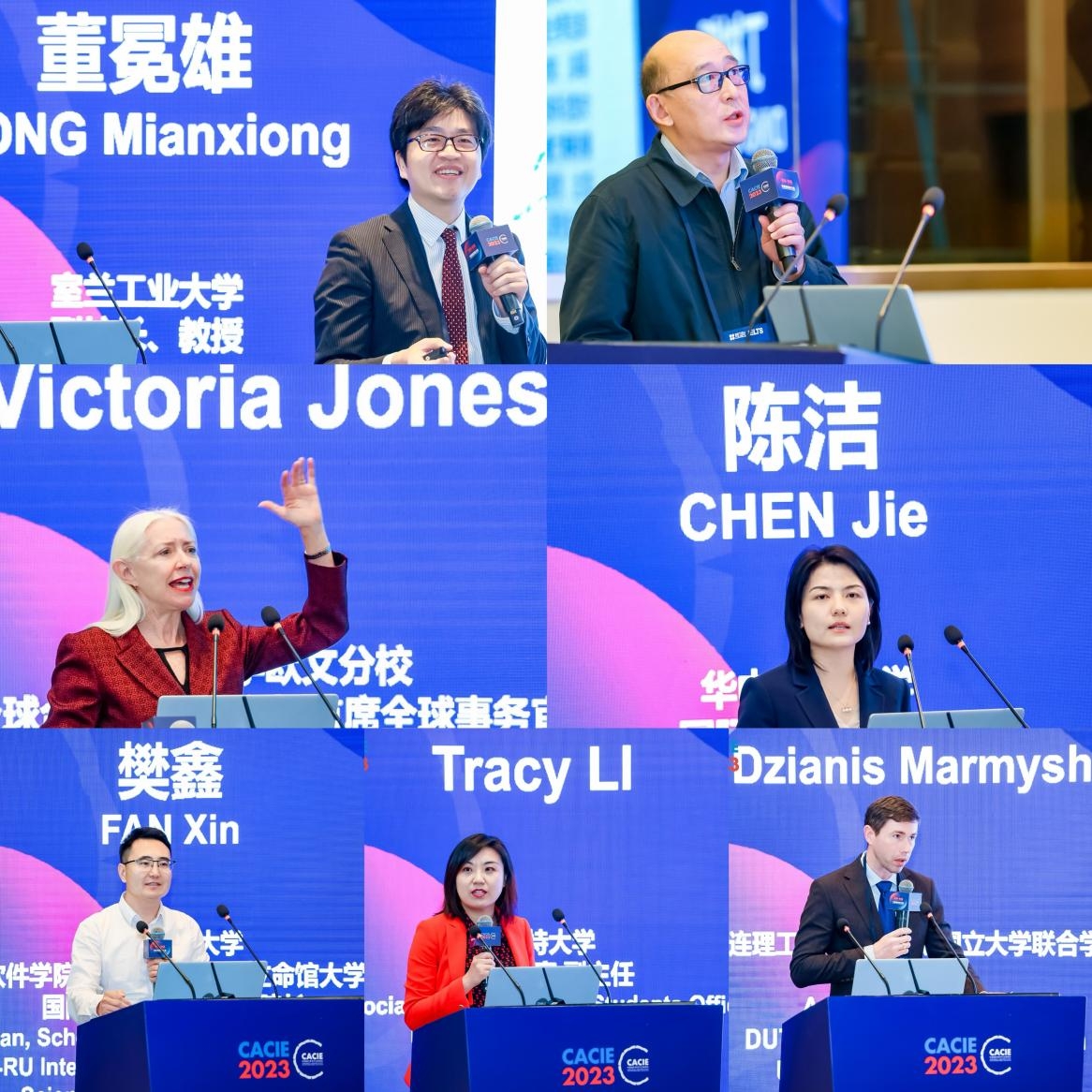 上海纽约大学副校长丁树哲教授、美国加州大学欧文分校全球合作事务办公室首席全球事务官Victoria Jones、华中科技大学国际交流处处长陈洁围绕“集聚全球人才赋能高等教育事业高质量发展”议题,介绍了各校应对新时代新挑战的路径举措、对人才培养与人才集聚工作的推进成果,并对未来高等教育事业的发展等方面进行了分享。日本室兰工业大学副校长董冕雄院士,英国莱斯特大学国际办公室副主任Tracy LI,我校白俄罗斯国立大学联合学院Dzianis Marmysh副教授,我校软件学院、中日国际信息与软件学院院长樊鑫围绕“面向未来的跨境教育”议题介绍了各校(院)在国际合作、跨境人才培养上的优质项目与宝贵经验,对未来全球教育的构建进行展望。