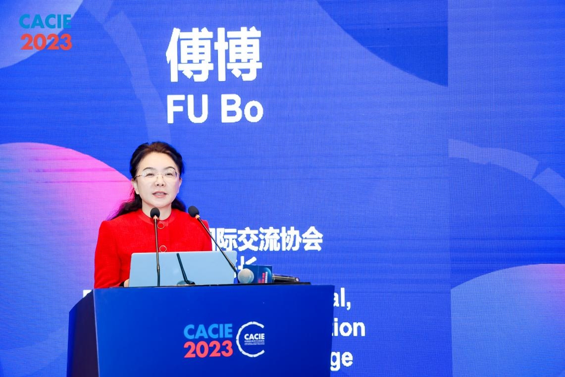 中国教育国际交流协会副秘书长傅博出席论坛并致辞。她介绍了中国教育国际交流协会在多边教育交流方面的经验与成就,指出国际合作对于高等教育水平提升具有重要意义,呼吁高校打造人才集聚区,并面向未来提出通过全球教育为人类创造福祉的倡议。