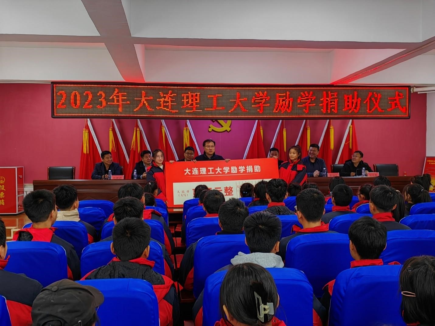 宋丹一行前往乌兰河硕乡中学,询问并了解学校办学情况,勉励学生努力学习,为建设中国特色社会主义现代化强国奋斗。宋丹代表学校向乡中学发放励学捐助金。