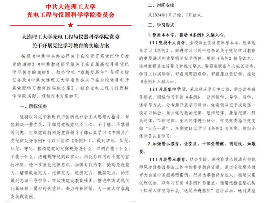 自党纪学习教育开展以来,光仪学院党委认真谋划、精心组织,多形式、多渠道、全覆盖开展党纪学习教育,将党纪学习教育与学院重点工作紧密结合,与班子建设紧密结合,坚持谋划在前、行动在先,成立工作专班,制定《关于开展党纪学习教育的实施方案》,召开党纪学习教育专题动员部署会,传达学习习近平总书记关于党纪学习教育重要指示批示精神,明确部署开展党纪学习教育的系列工作、重点要求,确保党纪学习教育取得扎实成效。